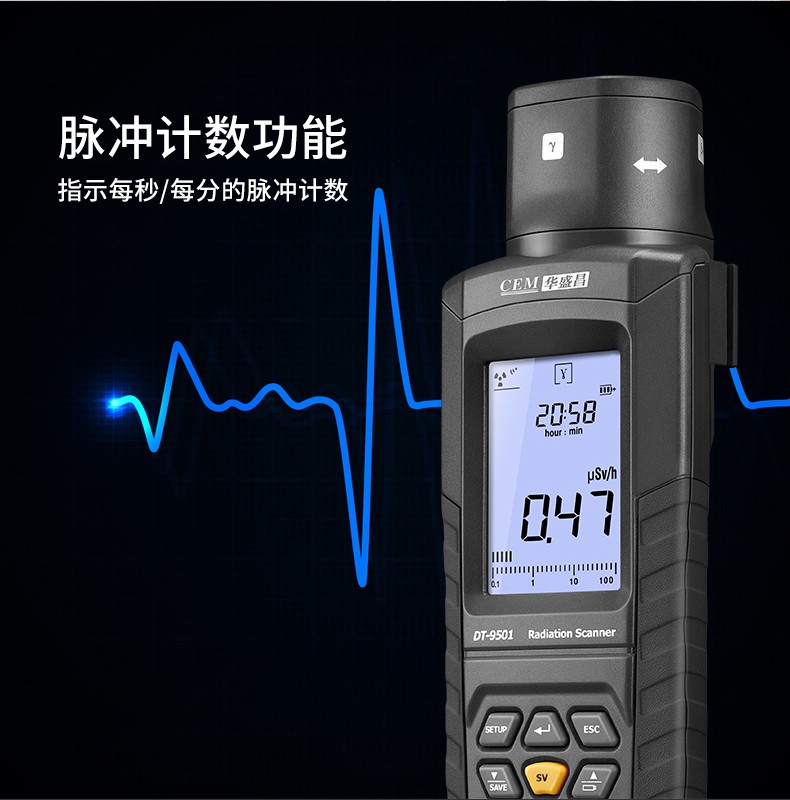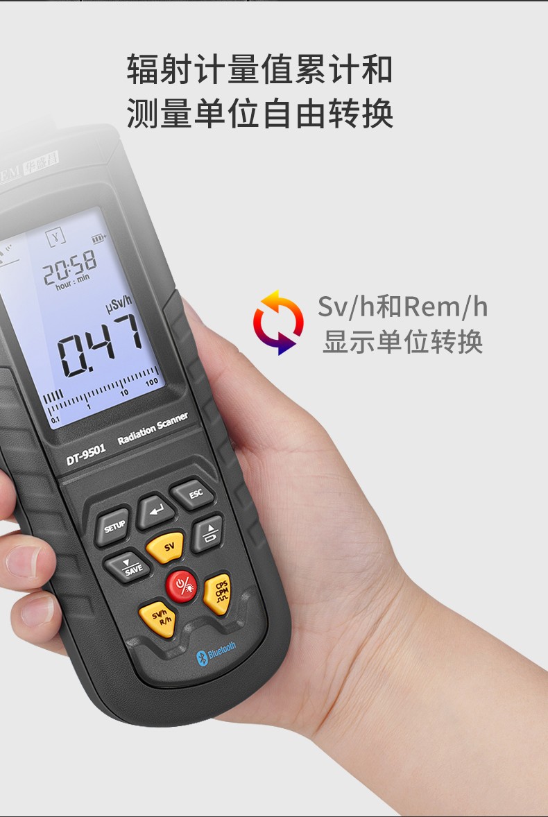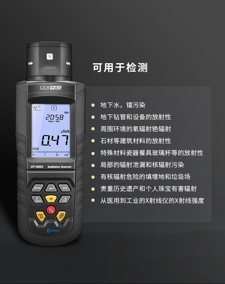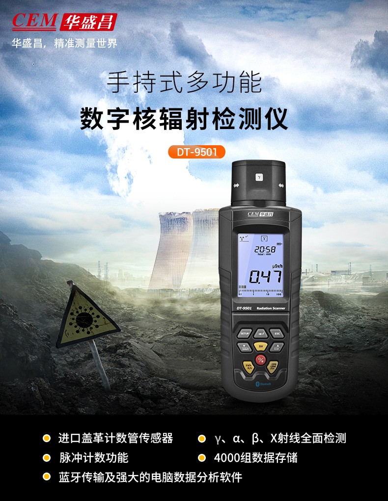华盛昌CEM DT-9501是一款新型核辐射检测仪,能够测量α、β、γ和X射线的辐射剂量率和脉冲剂量率,范围广泛,从0.01u Sv/h到1000u Sv/h。它还具备辐射剂量累计值和脉冲剂量累计值的功能,灵敏度高,支持射线选择开关,传感器采用卤素填装探测器。此外,它具有USB电脑连接和蓝牙传输功能,大屏幕LCD显示多种数据,支持报警功能、数据存储以及实时数据传输到电脑进行分析和记录,是一款功能强大且便携的核辐射检测仪器。