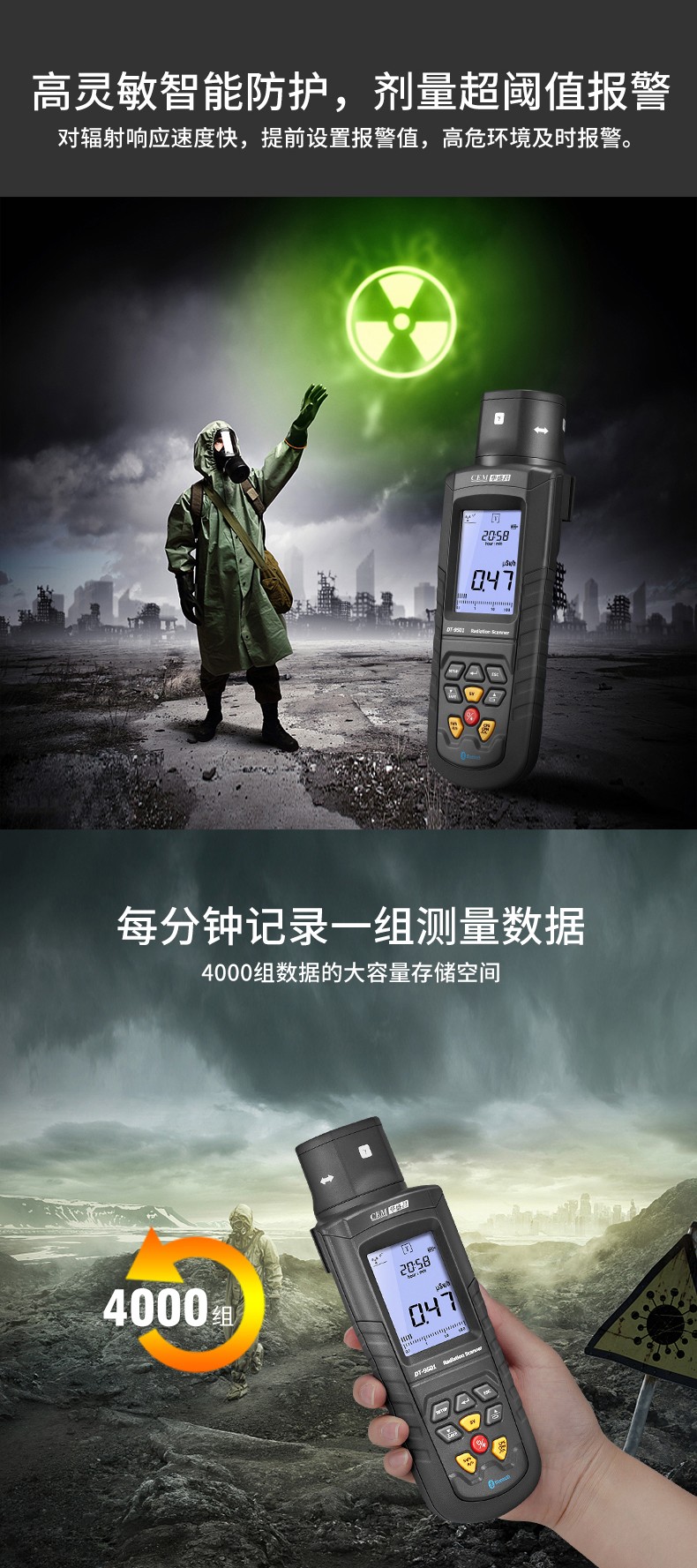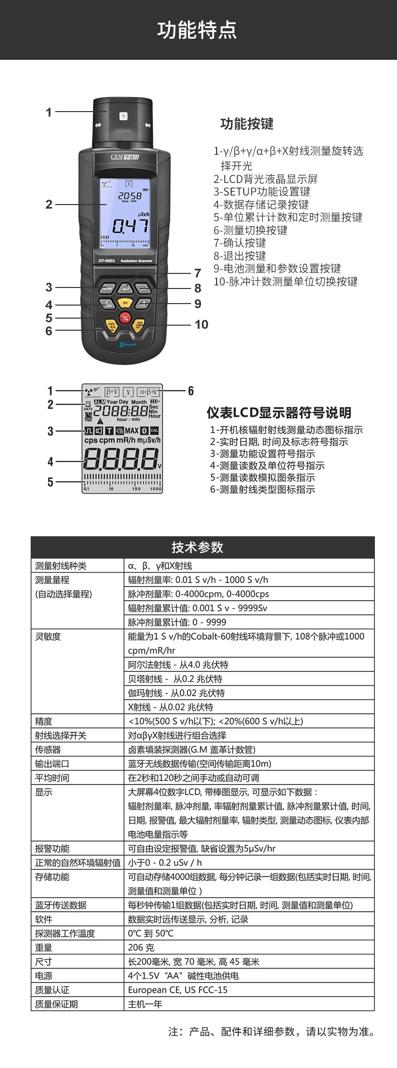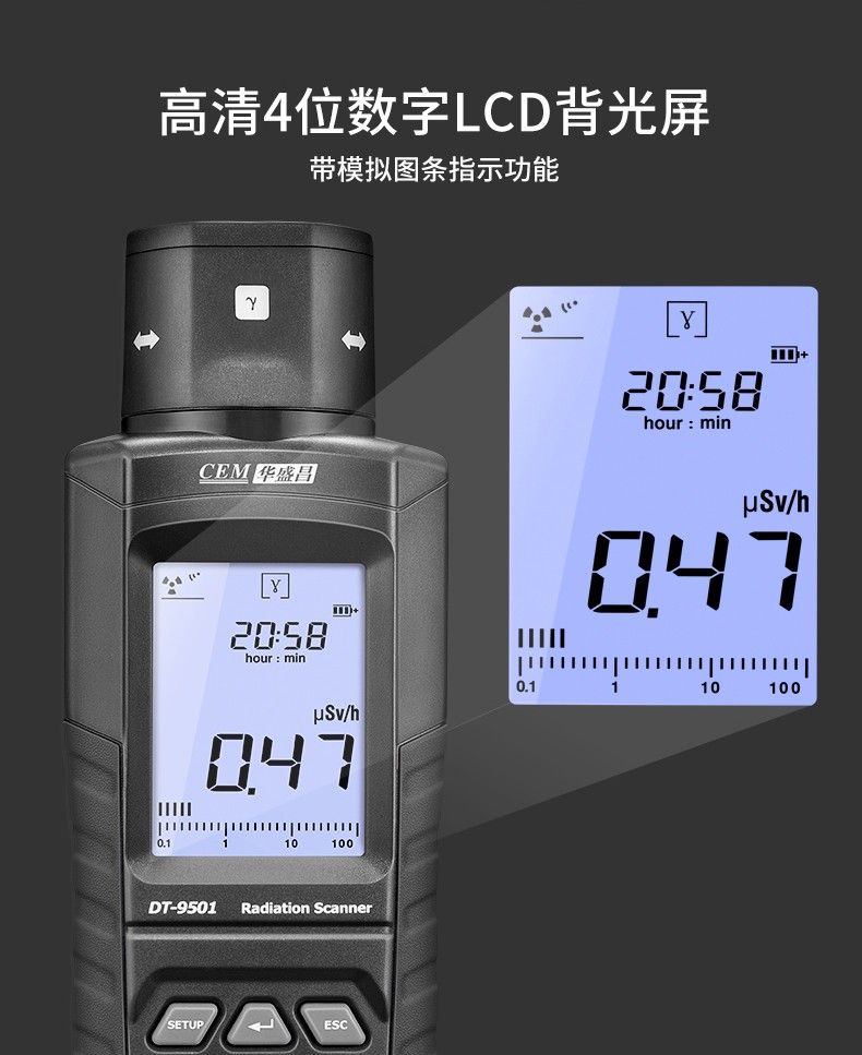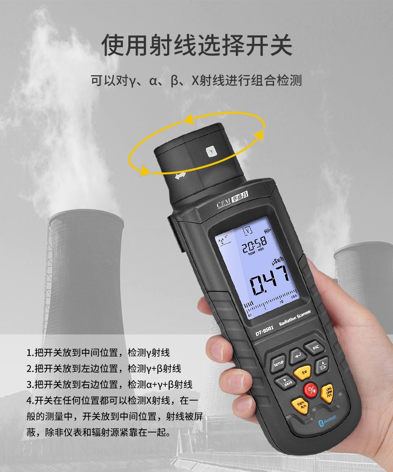 华盛昌CEM DT-9501是一款新型核辐射检测仪,能够测量α、β、γ和X射线的辐射剂量率和脉冲剂量率,范围广泛,从0.01u Sv/h到1000u Sv/h。它还具备辐射剂量累计值和脉冲剂量累计值的功能,灵敏度高,支持射线选择开关,传感器采用卤素填装探测器。此外,它具有USB电脑连接和蓝牙传输功能,大屏幕LCD显示多种数据,支持报警功能、数据存储以及实时数据传输到电脑进行分析和记录,是一款功能强大且便携的核辐射检测仪器。