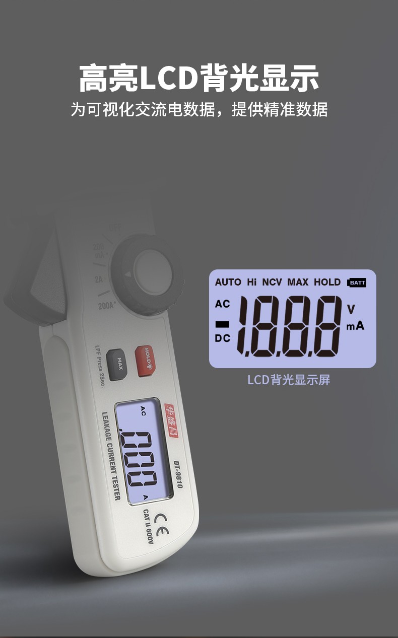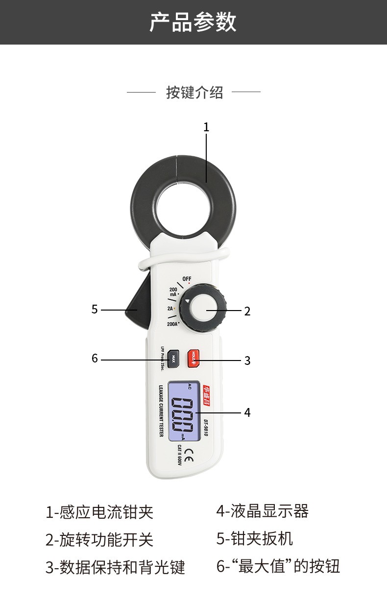 产品描述:交流电流测量范围200mA至200A,精度±(2.5%+8d),符合CAT III 600V安全标准,配备Φ30mm大钳口和自动关机功能。