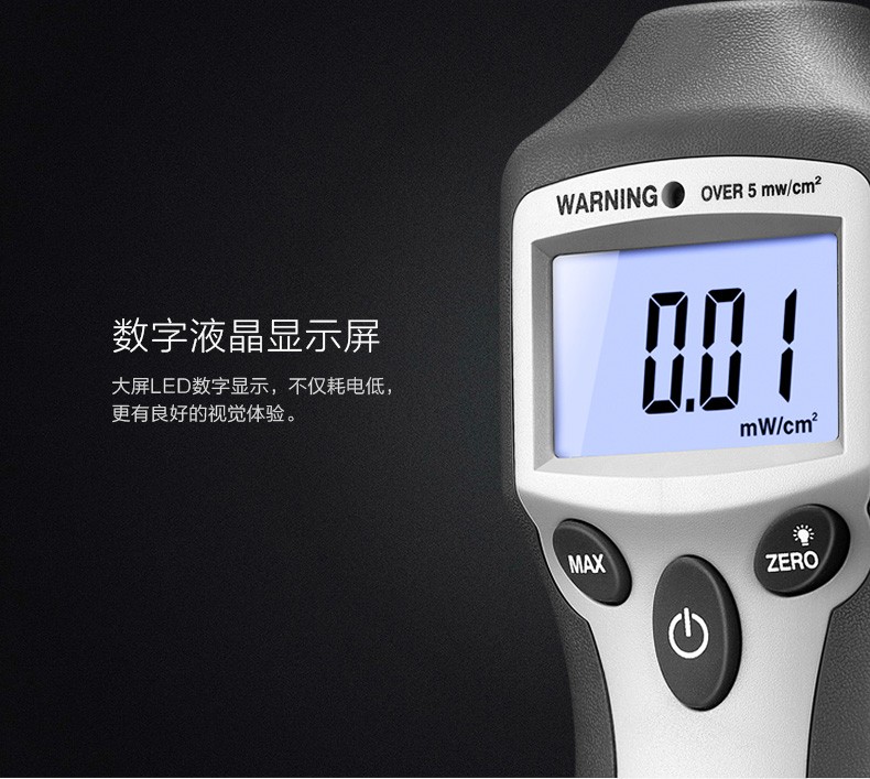 产品描述:测量范围0~9.99mW/cm²,精度±1dB,内置5.0mW/cm²警告值,160x60x42mm紧凑机身搭配9V电池供电,适合移动检测需求。