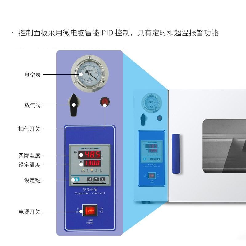 控制面板采用微电脑智能PID控制,具有定时和超温报警功能DZF-30系列为各层板自带独立发热管,DZF-50系列为内胆左右后下共四个面加热,令温度传热更均匀。