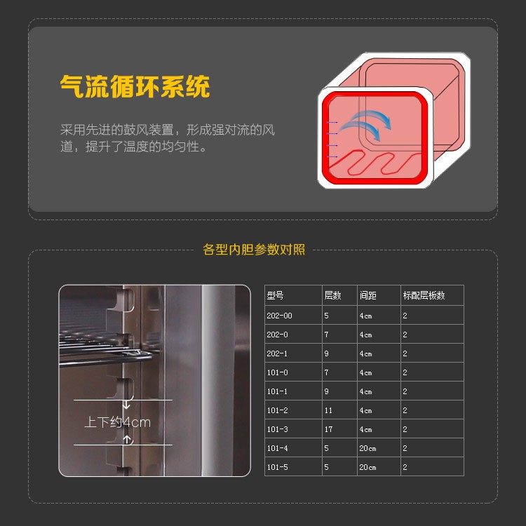 3.热风循环系统由低噪声风机和风道组成;