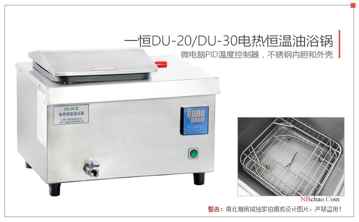 一恒DU-30 电热恒温油浴锅,锅内溶液为油,控温范围RT+20~200℃。 DU-30 电热恒温油浴锅 采用耐腐蚀不锈钢与微电脑的良好结合,更加安全性和稳定性,操作简单方便。