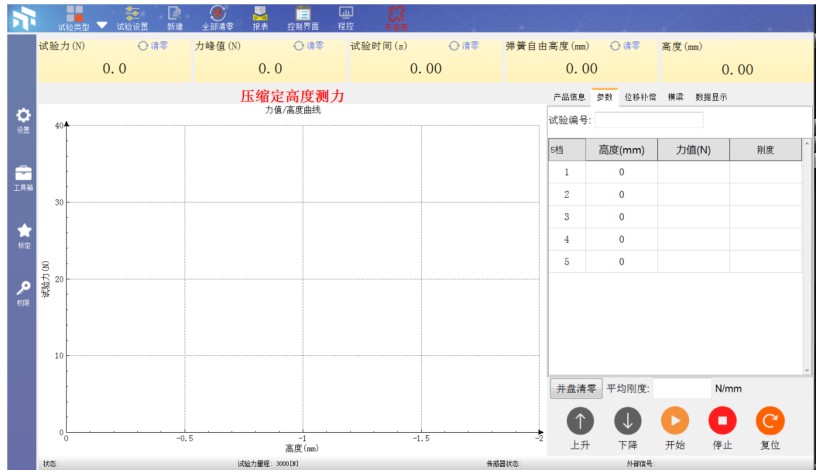 • 四种试验模式:定高度测力值、定变形测力值、定力值测高度、定力值测变形