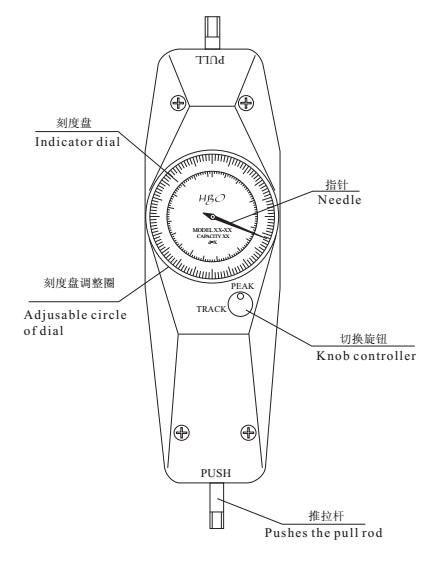 2)切换旋钮至于荷重峰值(PEAK)时,当测量达最大荷重值时,指针会停在最大荷重值的位置。可通过按下切换旋钮将指针归零。