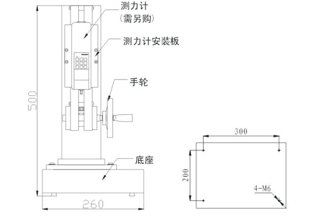 HCS-500数显侧摇式螺旋测试台的组成结构有:测力计(需要另购)、测力计安装板、手轮、底座。