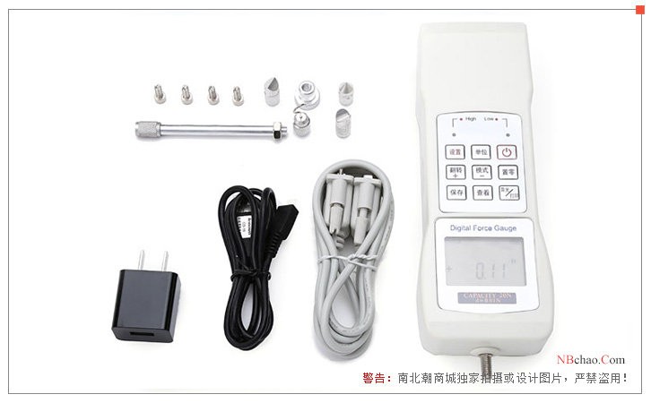 海宝仪器 HF-100K/200/300K/500K/1000K 拉力测试仪的组成结构:电平信号输出接口、通讯接口、电源适配器插孔、上限指示灯、下限指示灯、按键、显示窗、触头连接杆。