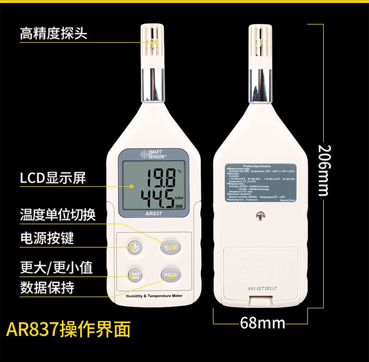 希玛AR837数字式温湿度计是一款简单实用的工具,可测量-10℃至50℃的温度范围和5%至98%的相对湿度范围。它具有温湿度误差较小的特点,温度误差仅为±1.5℃,湿度误差在不同湿度范围内也相对有限。此外,它支持温度单位的转换(℃/℉),采用分体式传感器位置设计,方便实用,适用于各种环境中的温湿度测量需求。通过9V电池供电,便于携带和使用。