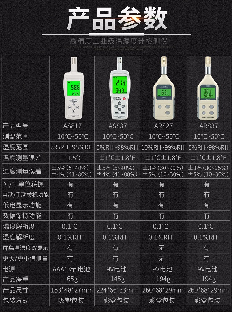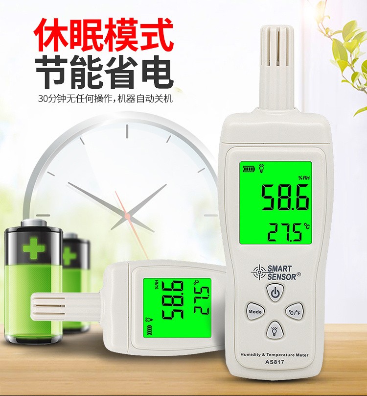 产品描述:分体式,温度量程-10~50℃,温度误差±1.5℃,温度分辨率0.1℃/℉,湿度量程5~98%RH,湿度误差 ±3%(41~80%) ±5%(10%~40%),湿度分辨率1%