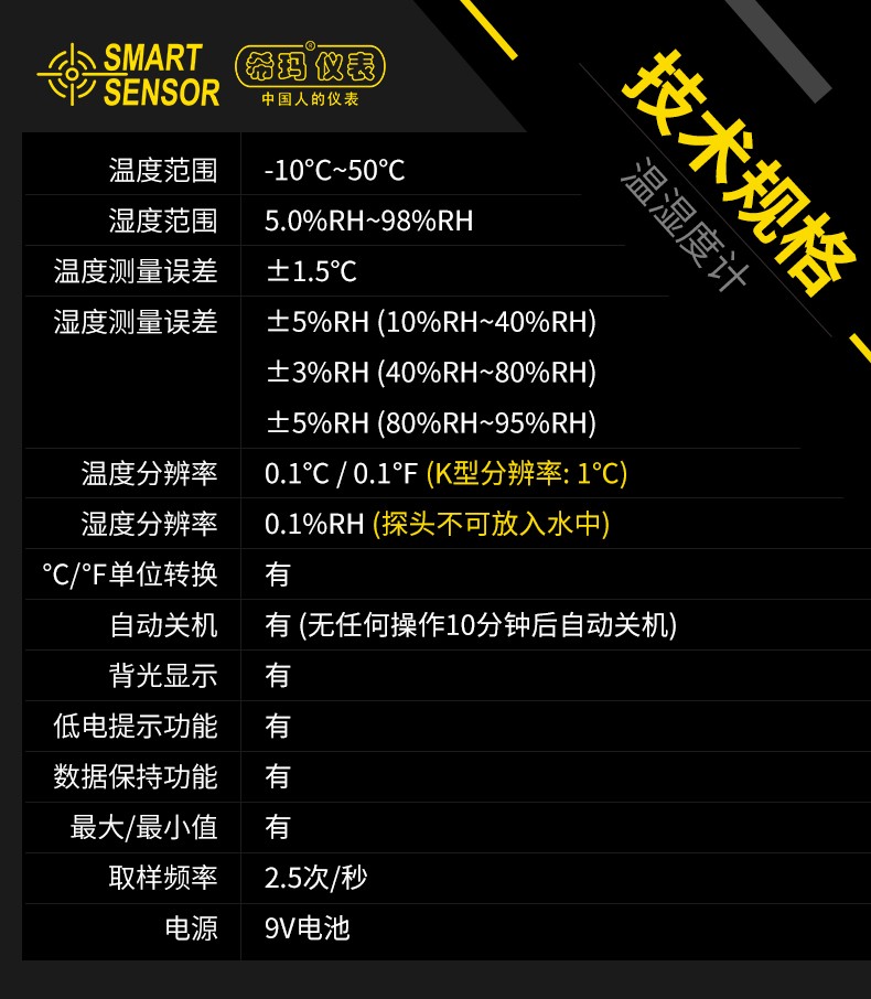 产品描述:温度量程-10~50℃,湿度量程5~98%RH,其温度测量误差为±1.5℃,湿度测量误差为±5%,并具备高分辨率(0.1℃和0.1%RH),支持℃/℉单位转换。