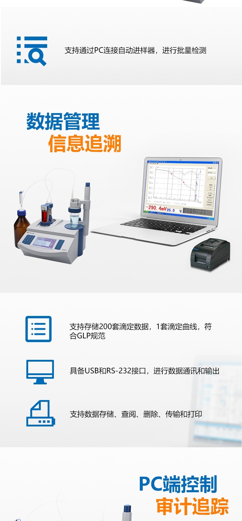 数据管理功能:支持存贮200套滴定结果和1套滴定曲线,符合GLP规范的测量信息,可追溯信息更完整;支持数据删除、查阅、打印或者输出;
