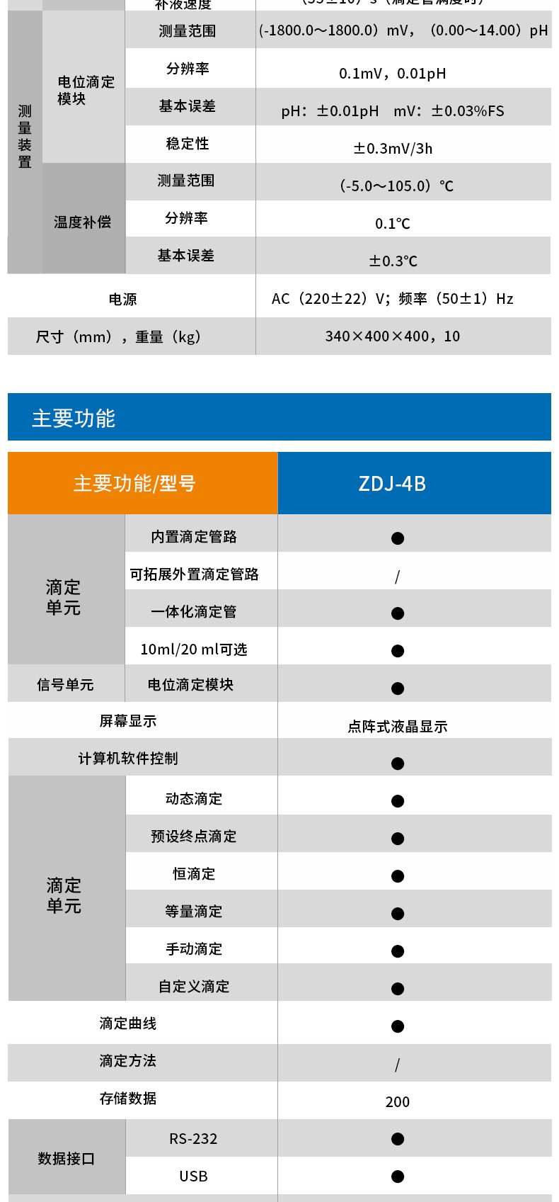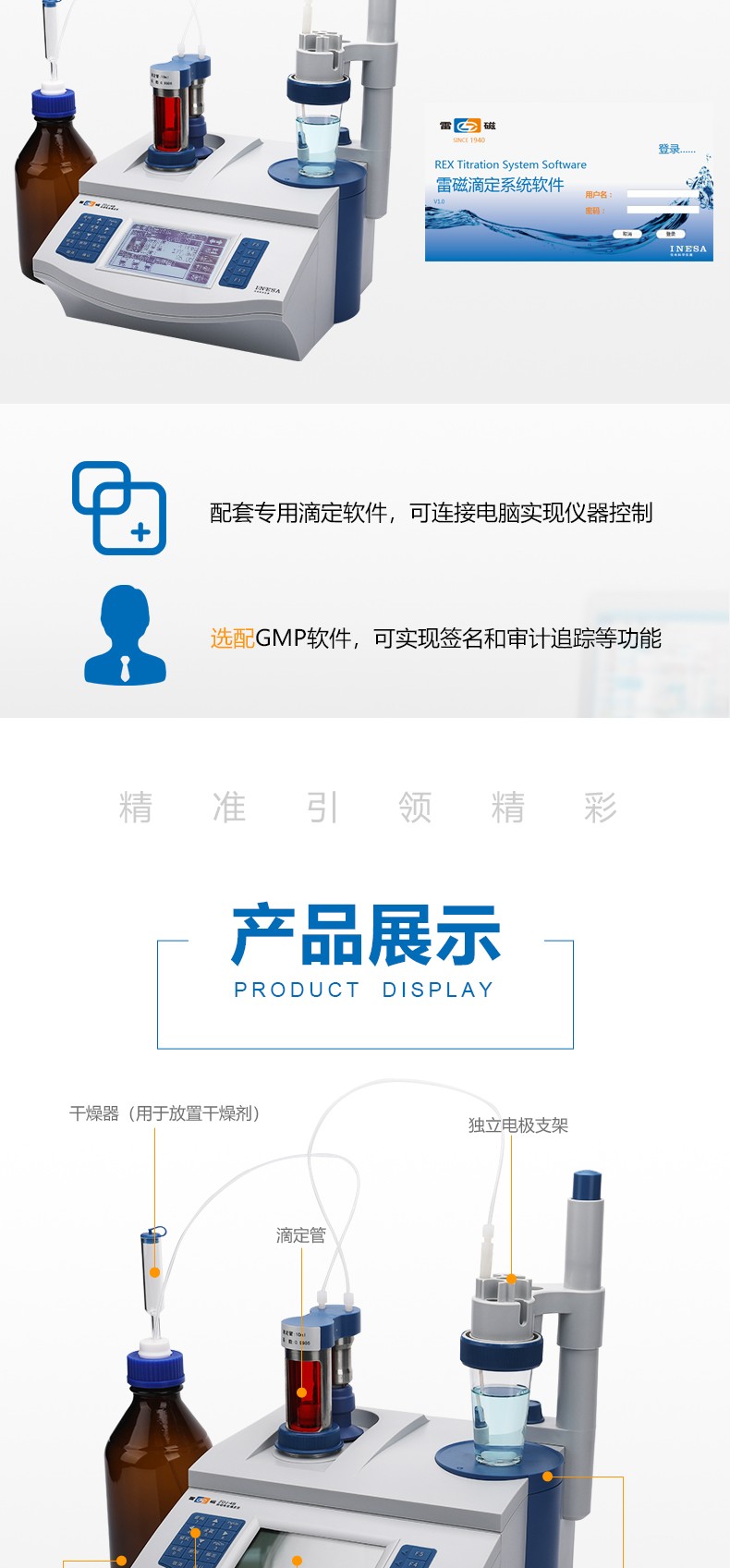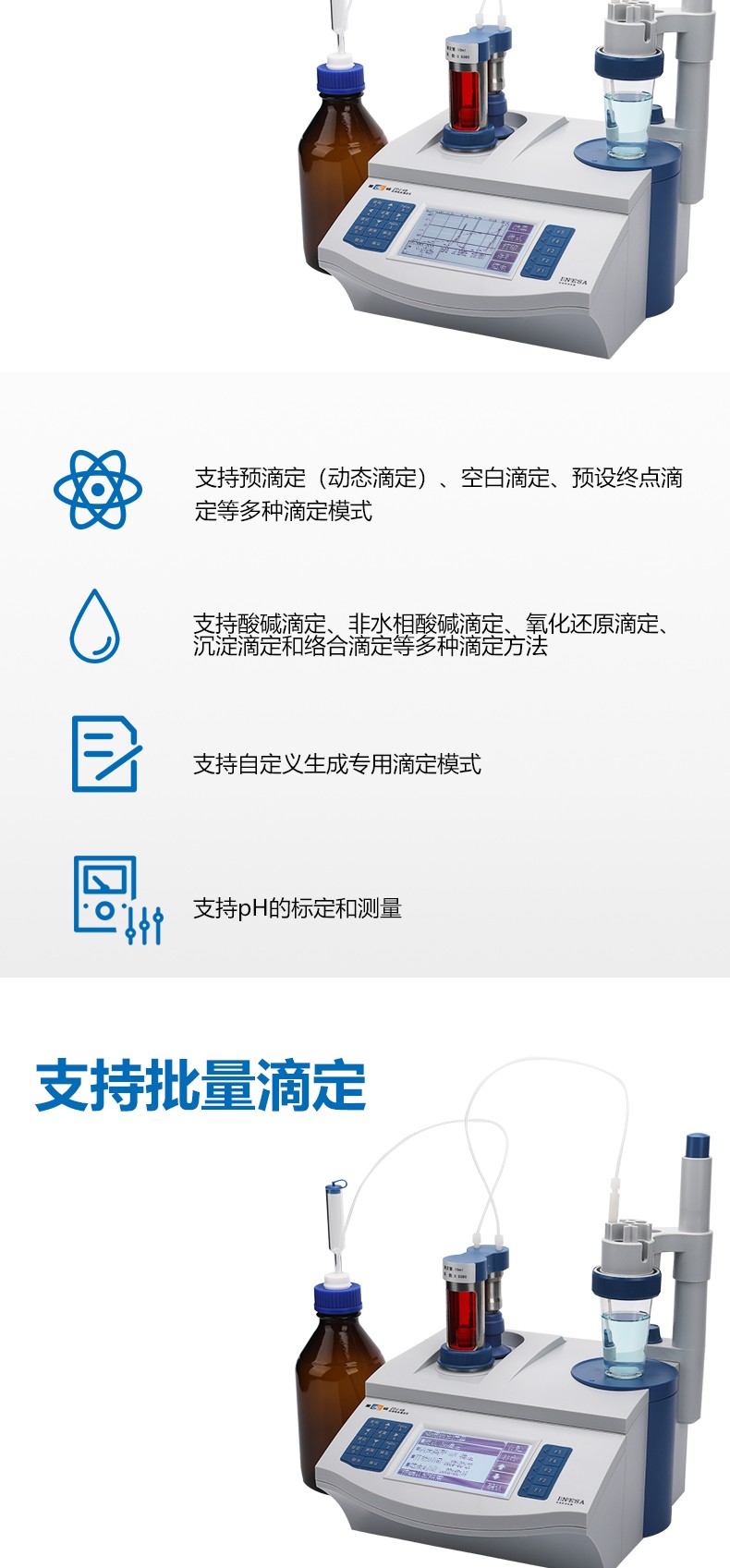 支持酸碱滴定、氧化还原滴定、沉淀滴定、络合滴定、非水滴定等多种滴定方法;支持滴定方法的建立、编辑、拷贝和查阅;支持pH测量功能。