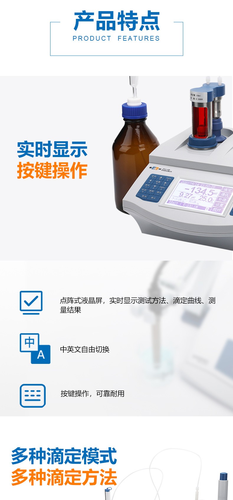点阵式液晶显示,按键操作,电脑中文软件同时控制或分别控制;实时显示有关测试方法、滴定曲线、测量结果;