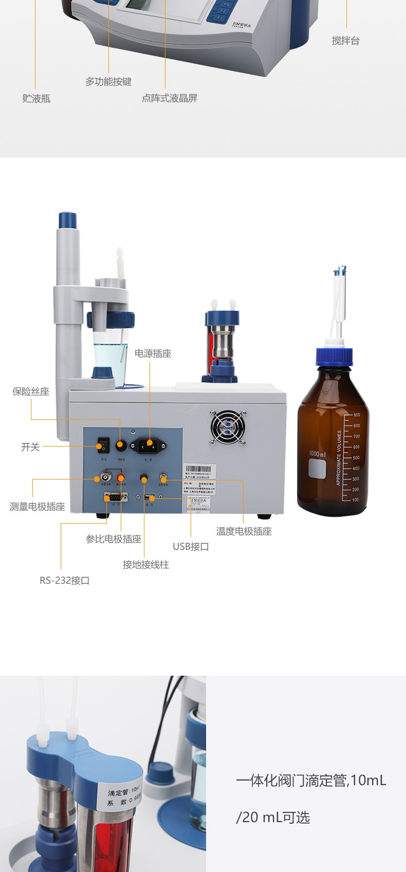 阀门滴定管一体化设计,方便更换,有效避免不同滴定时采用不同溶液的相互干扰问题;