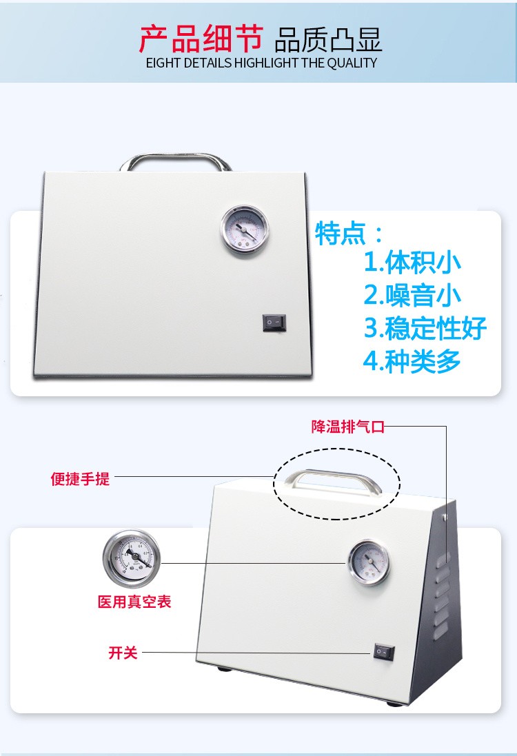 1.采用电磁式电机,隔膜密封气室,保证气体单向流动,真空度高。