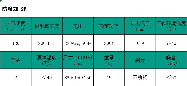 防腐隔膜真空泵的特点是与气体接触部分采用特殊材料,耐强酸强碱,适用于腐蚀性的化工、制药、石化气体等。此泵适用于真空过滤、减压蒸馏、旋转蒸发、真空浓缩、固相萃取等。这是一种高性价比产品,质量可靠,结构设计独特,适合大多数实验的需要。