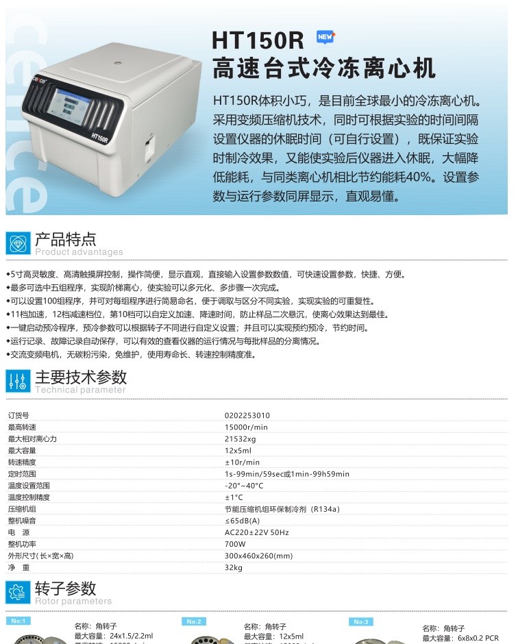 HT150R高速台式冷冻离心机体积小巧,是目前全球体积*小的冷冻离心机。采用变频压缩机技术,同时可根据实验的时间间隔设置仪器的休眠时间(可自行设置),既保证实验时制冷效果,又能使实验后仪器进入休眠,大幅降低能耗,与同类离心机相比节约能耗40%。设置参数与运行参数同屏显示,直观易懂。