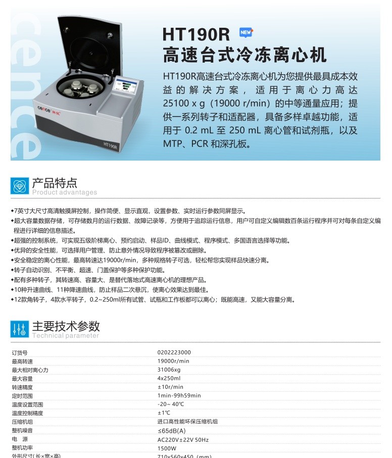 全部商品分类HT190R高速台式冷冻离心机为您提供更具成本效益的解决方案,适用于离心力高达25100 x g(19000 r/min)的中等通量应用;提供一系列转子和适配器,具备多样优异功能,适用于 0.2 mL 至 250 mL 离心管和试剂瓶,以及 MTP、PCR 和深孔板。