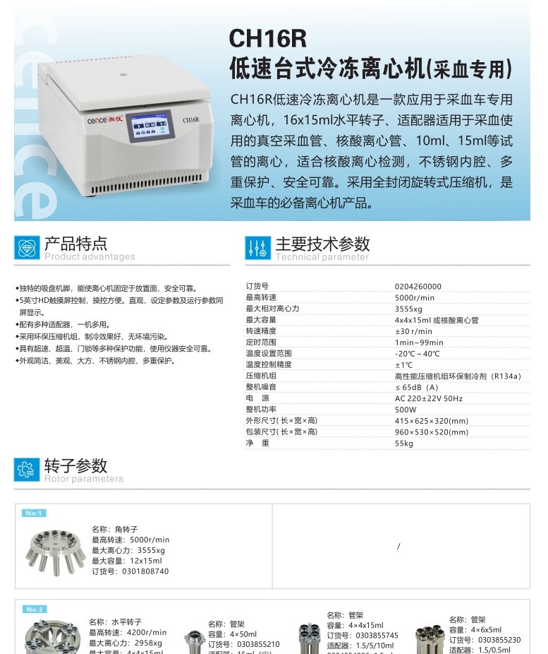CH16R低速冷冻离心机是一款应用于采血车专用离心机,16x15ml水平转子、适配器适用于采血使用的真空采血管、核酸离心管、10ml、15ml等试管的离心,适合核酸离心检测,不锈钢内腔、多重保护、安全可靠。采用全封闭旋转式压缩机,是采血车的必*离心机产品。