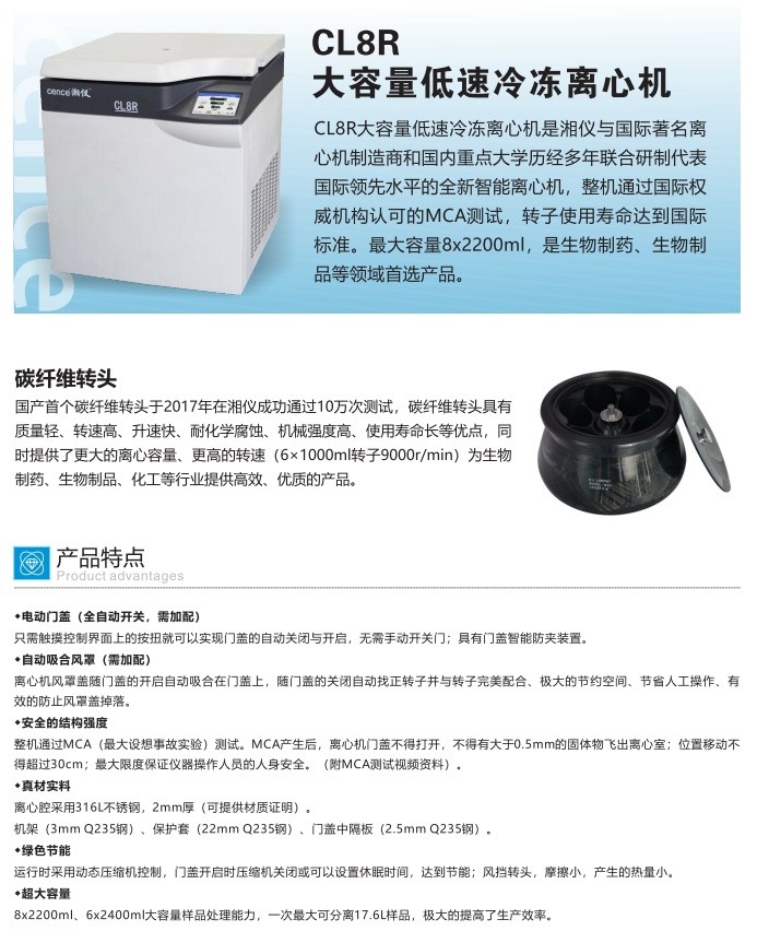 CL8R大容量低速冷冻离心机是湘仪与国际著*离心机制造商和国内重点大学历经多年联合研制代表国际领*水平的全新智能离心机,整机通过国际权威机构认可的MCA测试,转子使用寿命达到国际标准。最*容量8x2200ml,是生物制药、生物制品等领域首*产品。