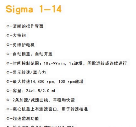 德国Sigma Laborzentrifugen公司是世界著名的专业离心机生产厂家之一,只专注于研发、生产离心机产品,自1948至今,已经有近80年的离心机研发、生产历史,为用户提供多种离心机产品及种类非常丰富的配套角转子、水平转子及配件,可根据每一个客户的需求为其提供最佳的离心解决方案,除拥有常规紧凑小型离心机、高速或大容量离心机、冷冻或非冷冻型离心机外,还可提供加热型、惰性气体填充型、洁净间型、水冷型等多种特色产品,应用领域包括药物研究、生物技术、医疗检测、环境分析和石油化工等诸多领域。Sigma离心机以其可靠的性能与高标准的安全性而闻名遐迩。