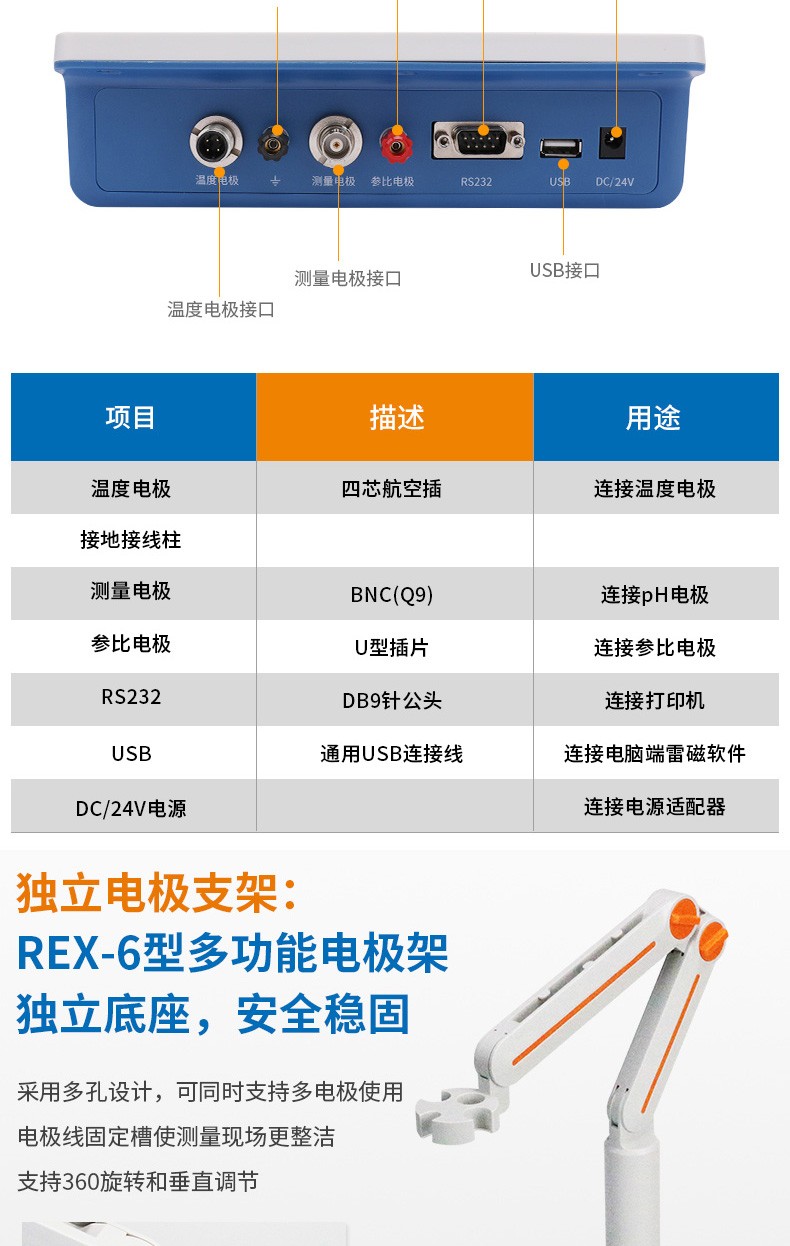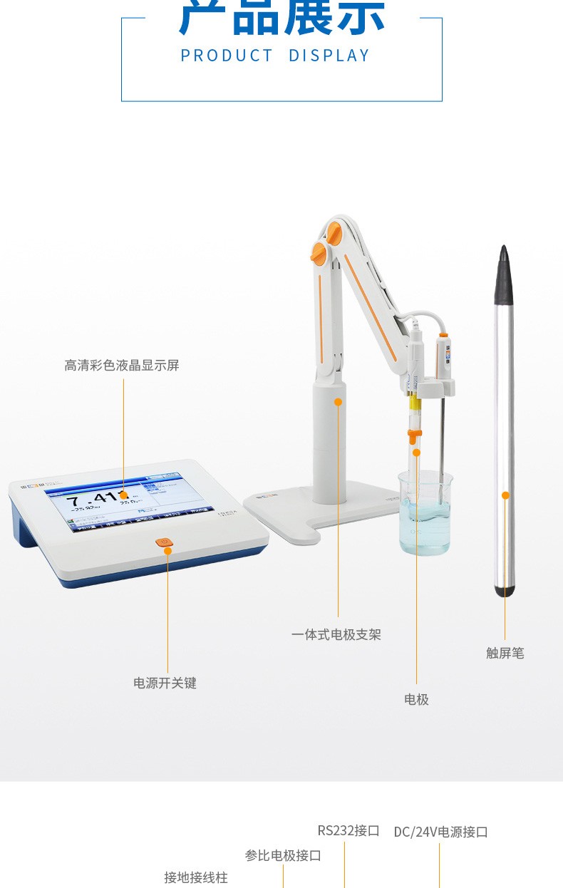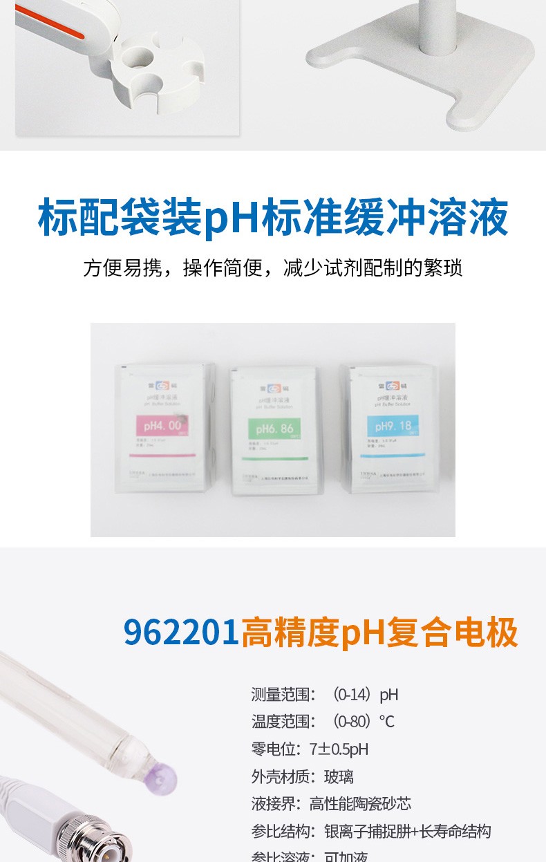 ● 标配高精度复合pH电极、温度电极、独立电极支架、防尘罩和袋装pH缓冲溶液