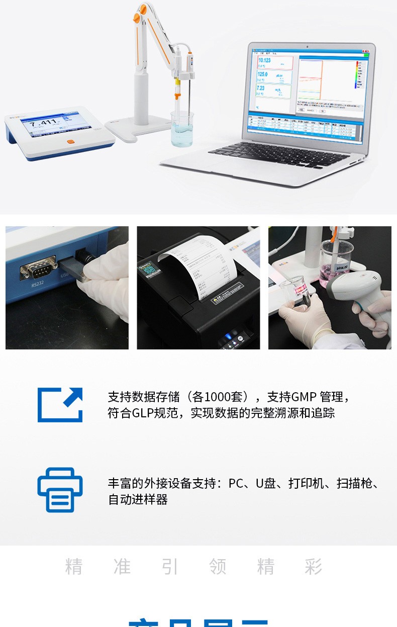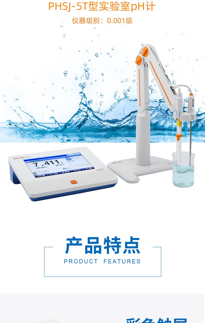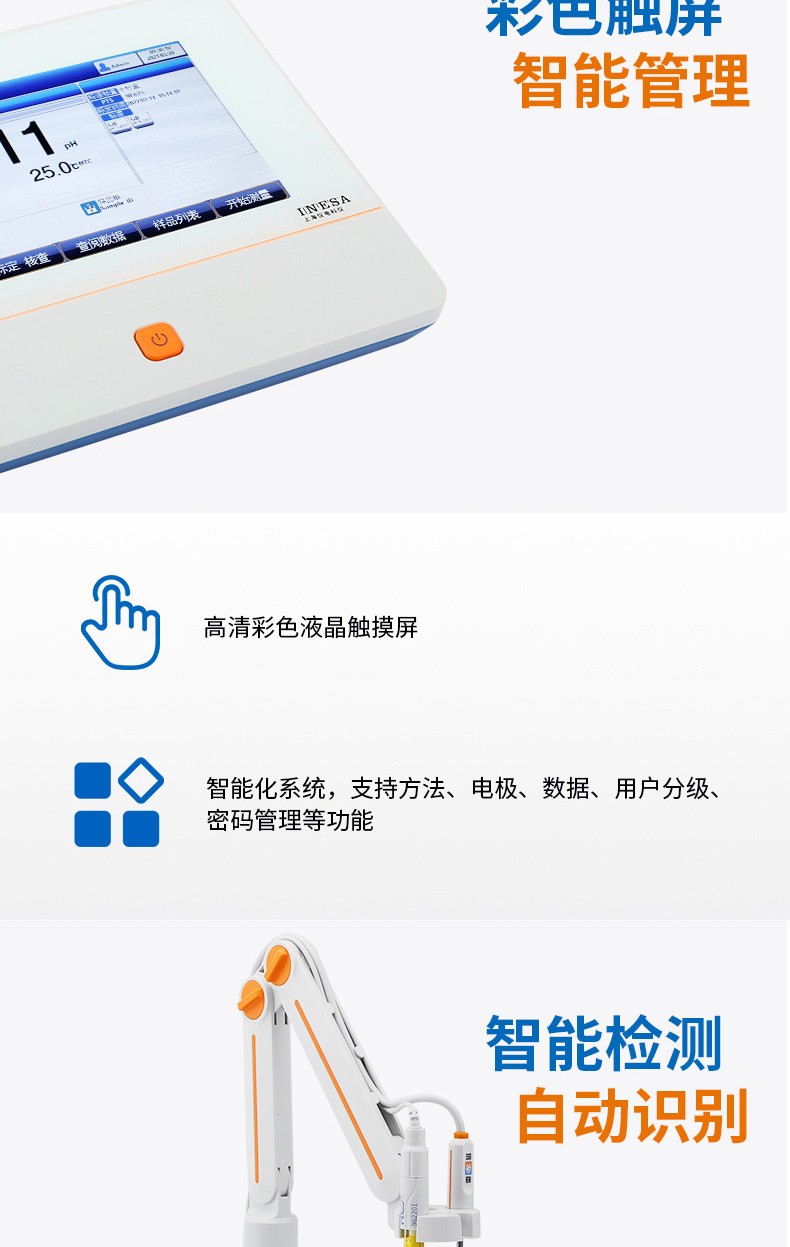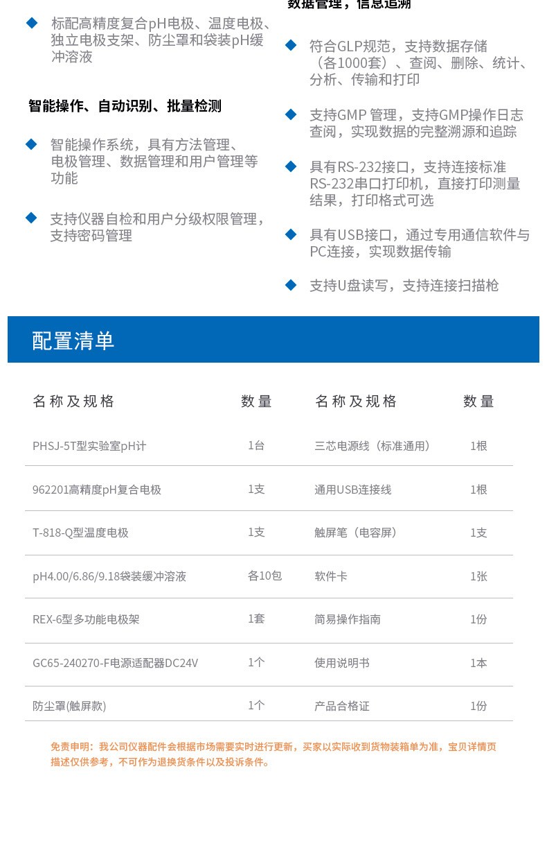 ● 标配高精度复合pH电极、温度电极、独立电极支架、防尘罩和袋装pH缓冲溶液