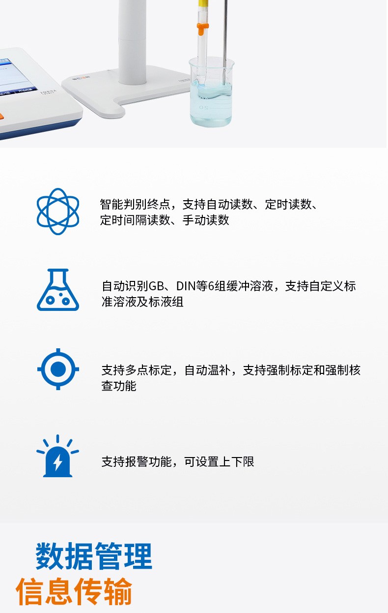 ● 可自动识别GB、DIN、NIST、USA、MERK、JIS等6组缓冲溶液,支持自定义标准溶液及标液组