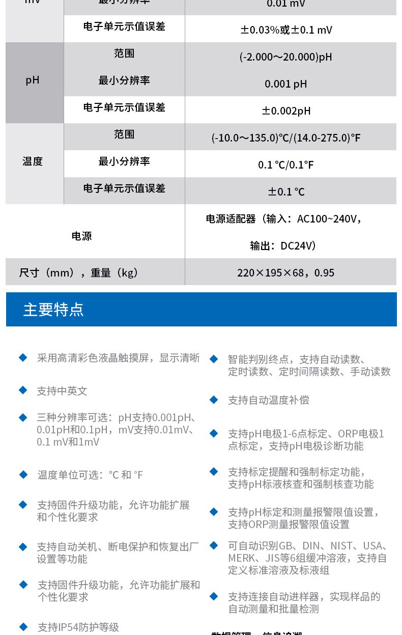 ● 三种分辨率可选:pH支持0.001pH、0.01pH和0.1pH,mV支持0.01mV、0.1 mV和1mV
