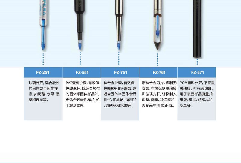 产品描述:钛合金护套,有效保 护玻璃杆绝无腐蚀。更 适合固体半固体食品测试,如乳酪、面制品 、肉制品和水果等。