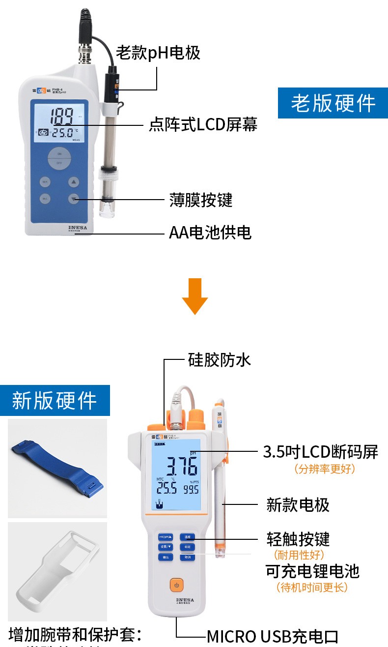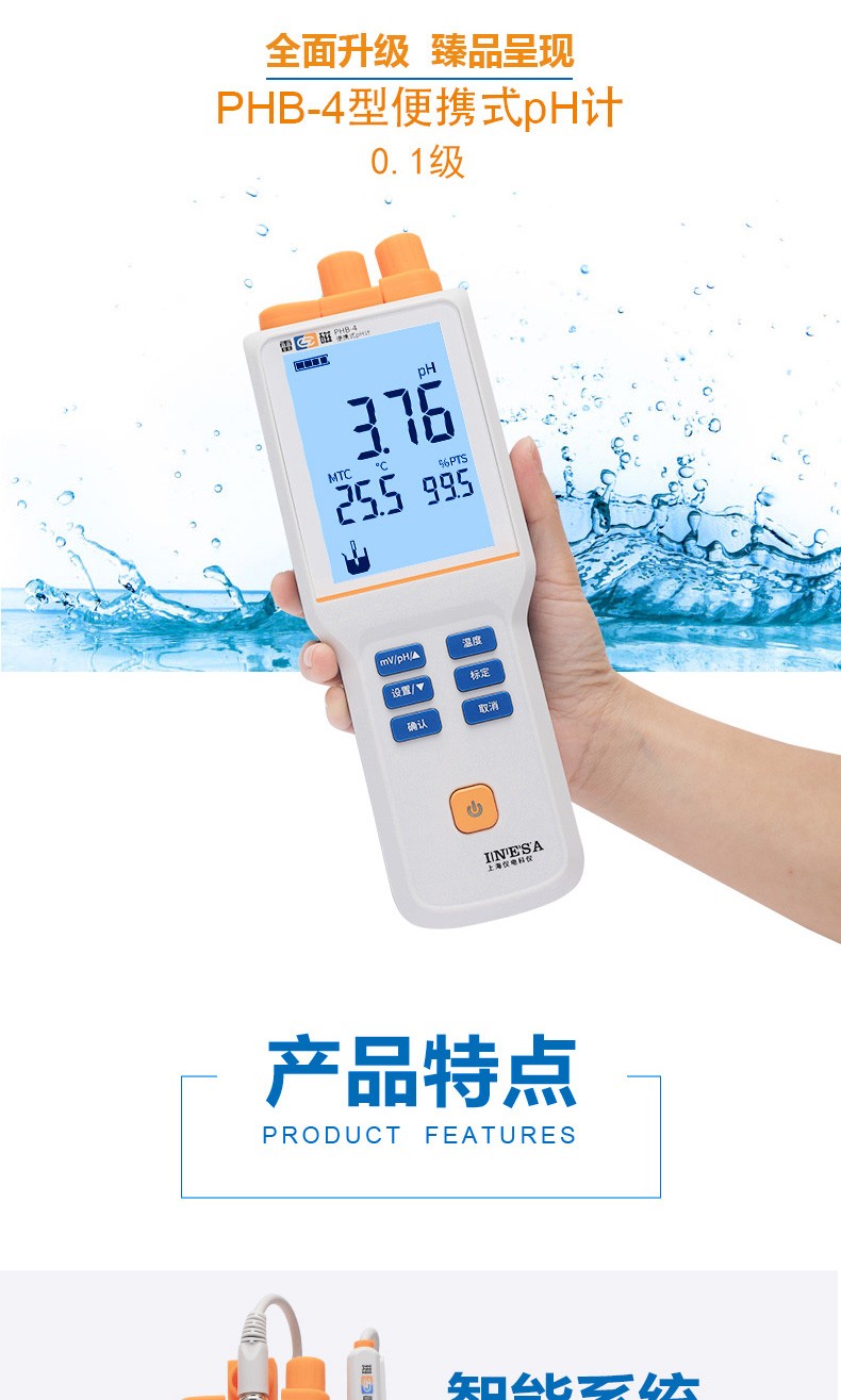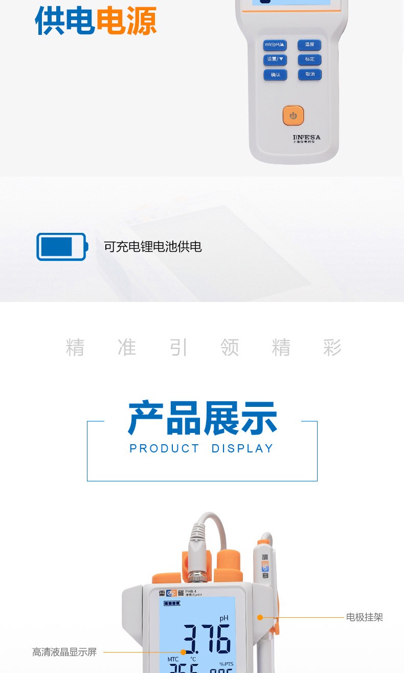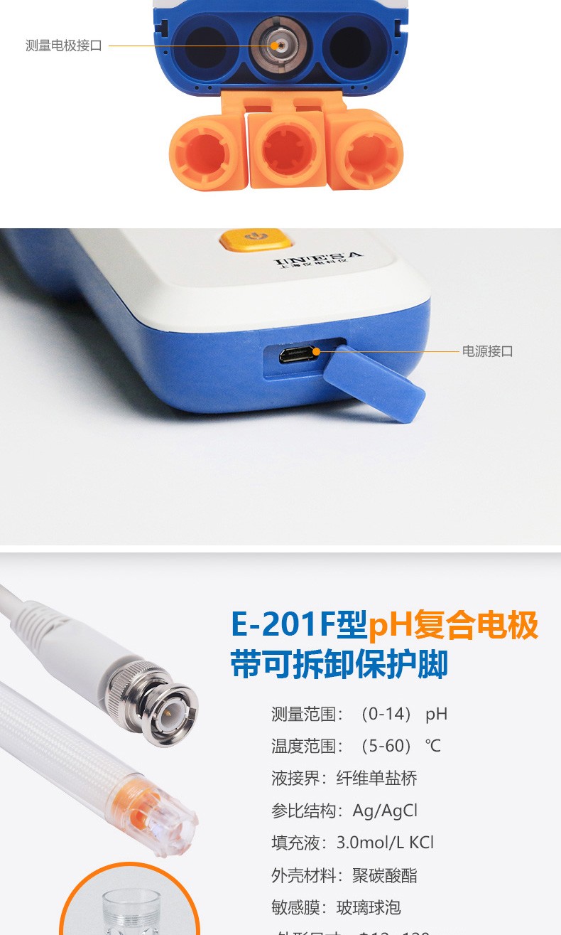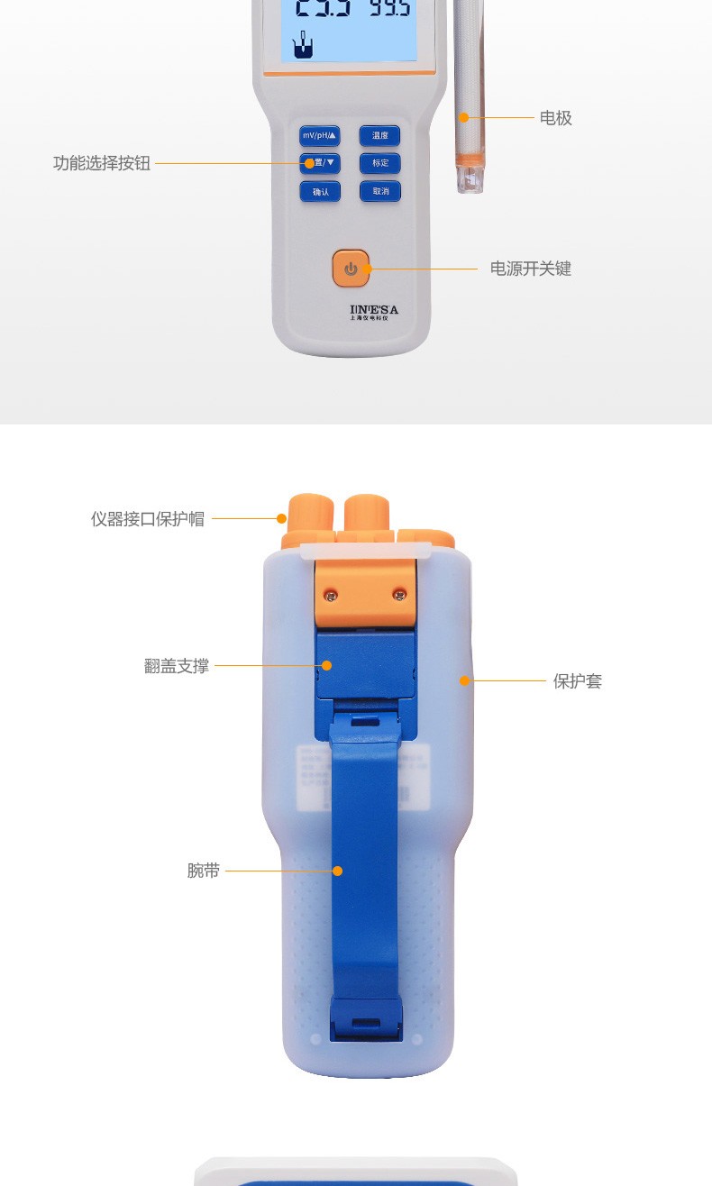 ● 标配复合pH电极、电极挂架、硅胶保护套、腕带、校准缓冲粉剂