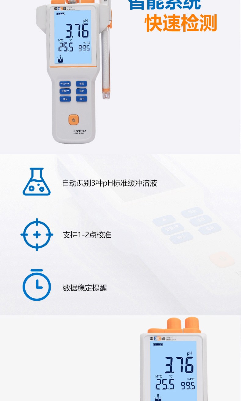 ● 自动识别GB 4.00pH、6.86pH、9.18pH三种pH标准缓冲溶液,支持自定义pH缓冲溶液