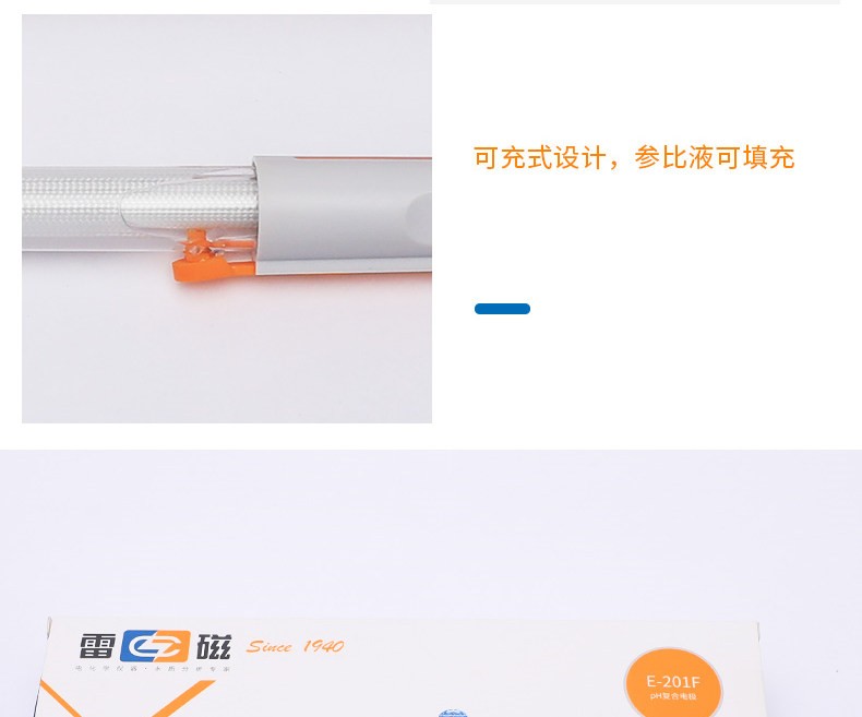 | E-201G型pH可充式复合电极 | 0-14pH、5-60℃ | 二合一pH电极,保护脚可拆卸,适用于粘稠样品 | BNC(Q9型) |