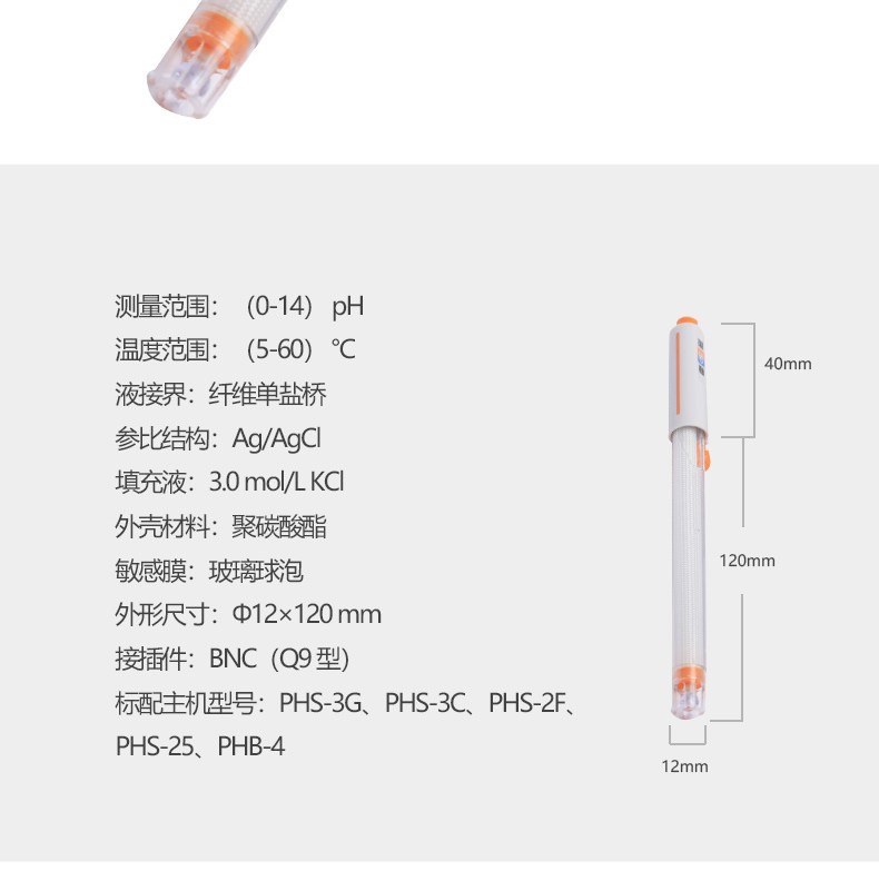 | E-301F型pH三复合电极 | 0-14pH、5-60℃ | 三合一常规样品pH电极 | BNC(Q9型&Q6型) |