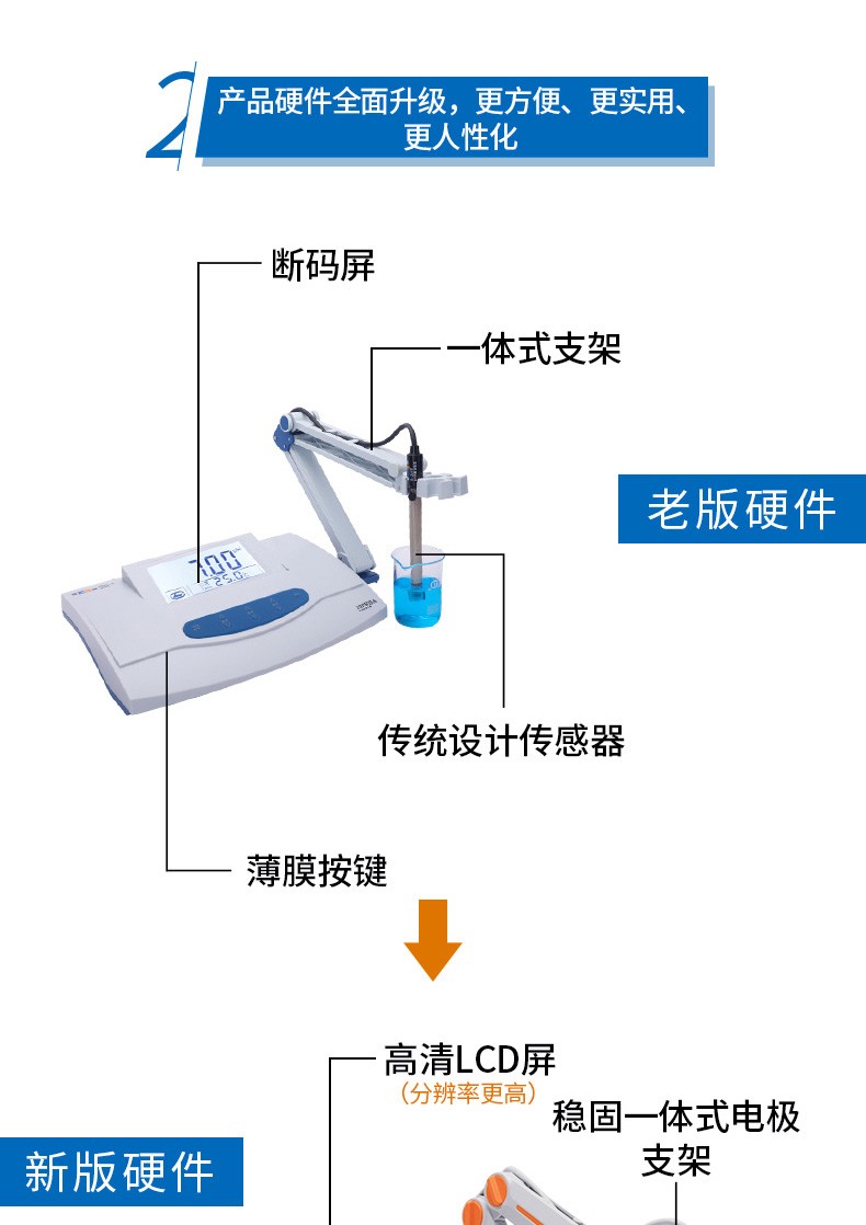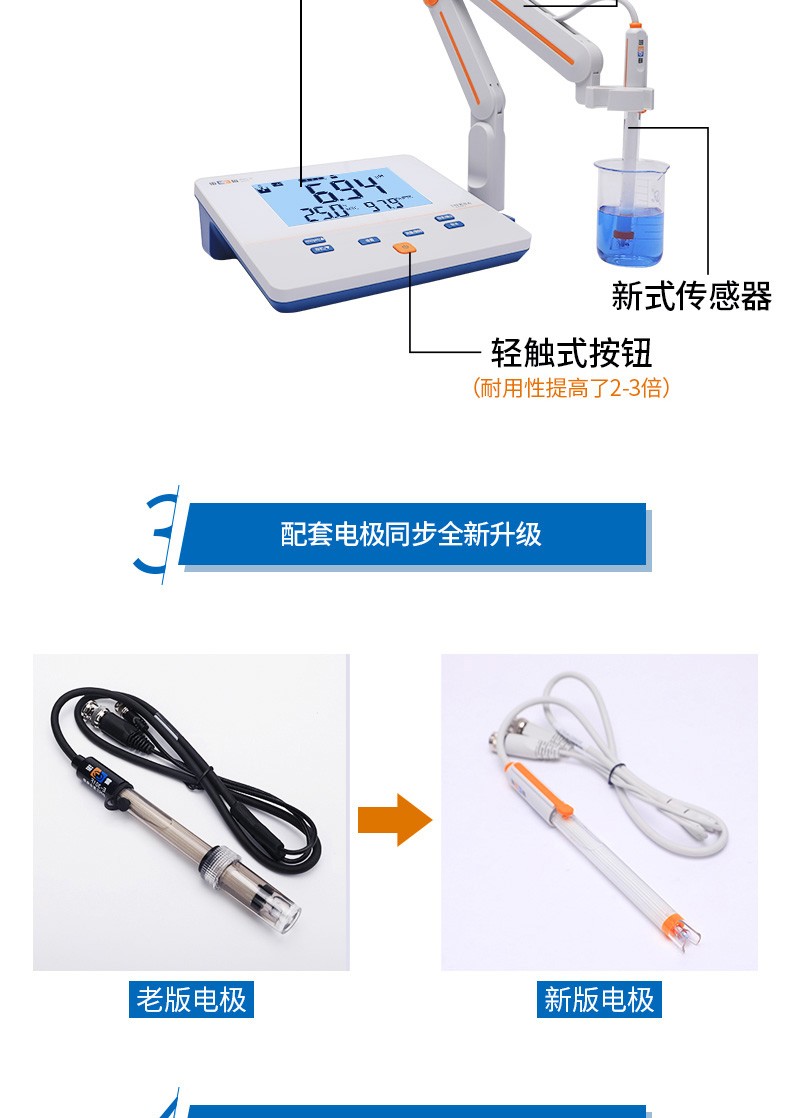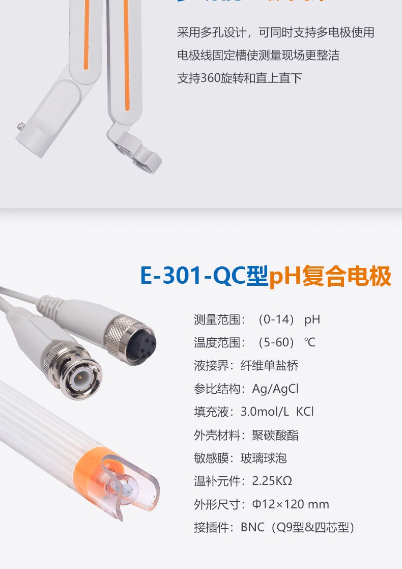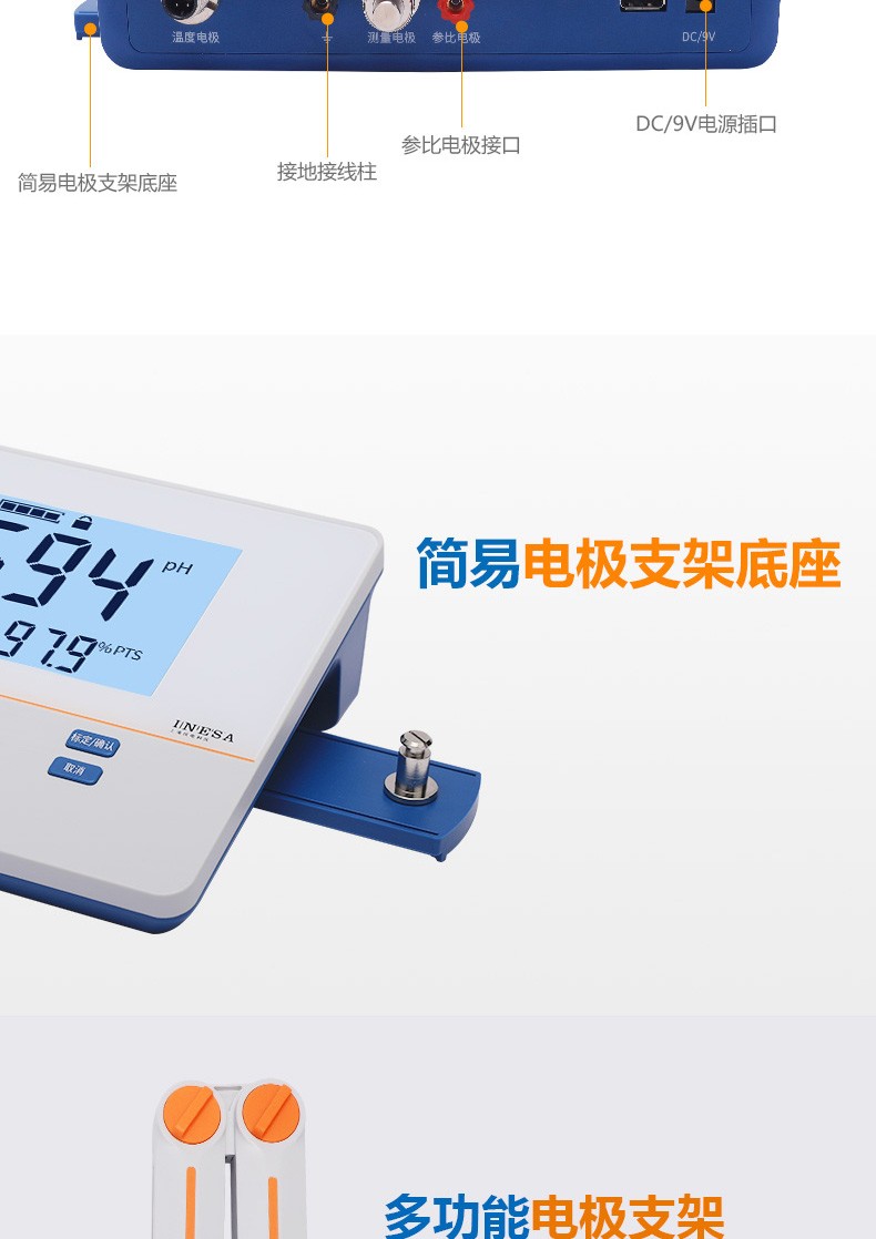 ● 标配三复合pH电极、电极支架、防尘罩和校准缓冲粉剂