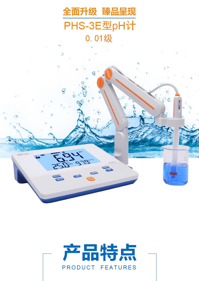 雷磁PHS-3E 精密ph计是一种台式的数显式PH计,两种型号的测量分辨率均为0.01pH,mV值分辨率为1mV。PHS-3E精密ph计是自动进行温度补偿,分别配备E-201F复合电极和E-301F复合电极。PHS-3E精密ph计能测量温度值。本精密ph计是实验室使用的PH计,在化工、食品、科研机构、高等院校等领域广泛应用。