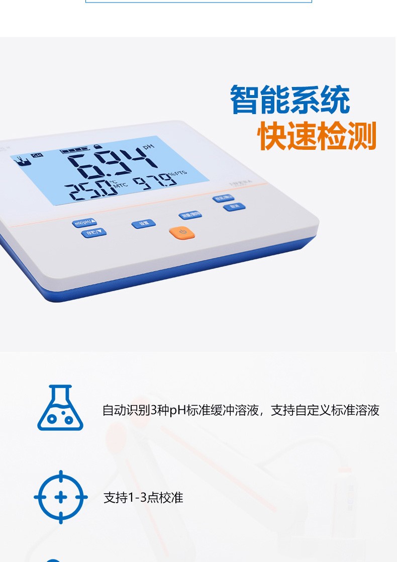 ● 自动识别GB 4.00pH、6.86pH、9.18pH三种pH标准缓冲溶液,支持自定义pH缓冲溶液