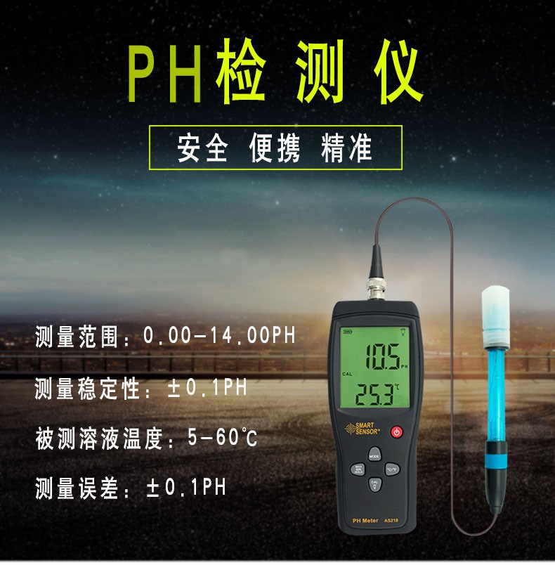 希玛 AS218 PH值检测仪具有广泛的PH测量范围,从0.00到14.00,稳定性高,零点漂移仅为±0.03。它提供了高度准确的PH值测量,基本误差仅为±0.05,适用于不同的实验和应用场景。此外,它还支持溶液温度补偿,范围从0℃到60℃,并具有良好的重复性。产品便携轻巧,适合在各种环境条件下进行PH值测量,是实验室和工业领域的可靠选择。
