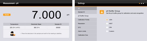 • 可选pH缓冲标准(USA/NIST/DIN)或进行5点自定义校准。