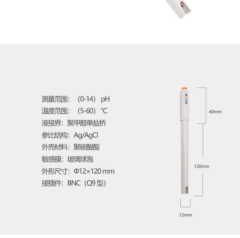 | E-201-CF型pH复合电极 | 0-14pH、5-60℃ | 二合一常规样品pH电极,含防水插件 | BNC(Q9防水型) |
