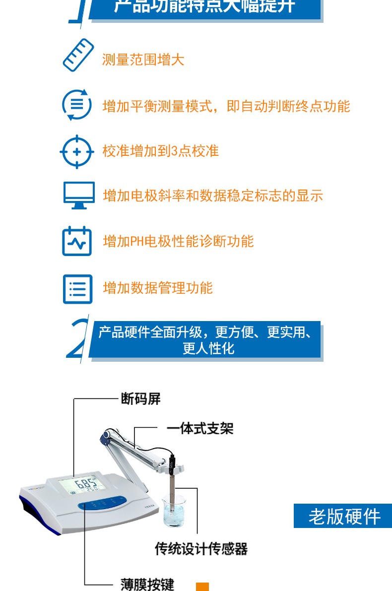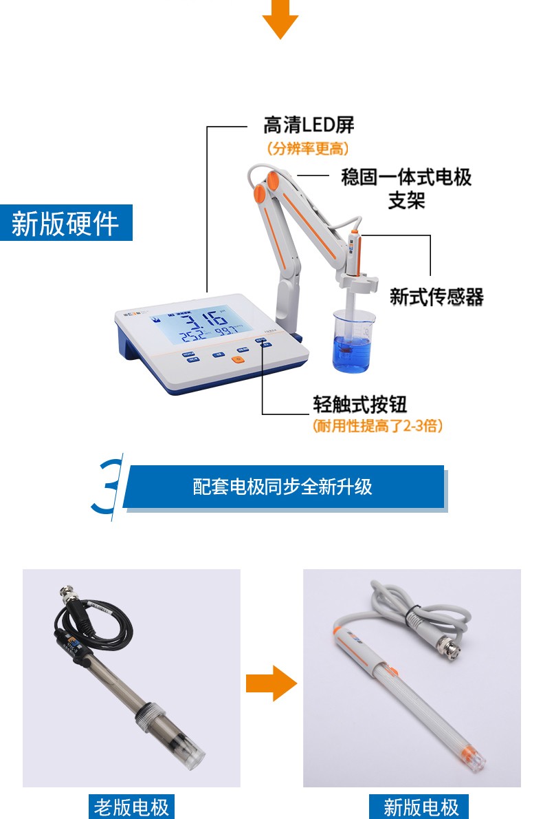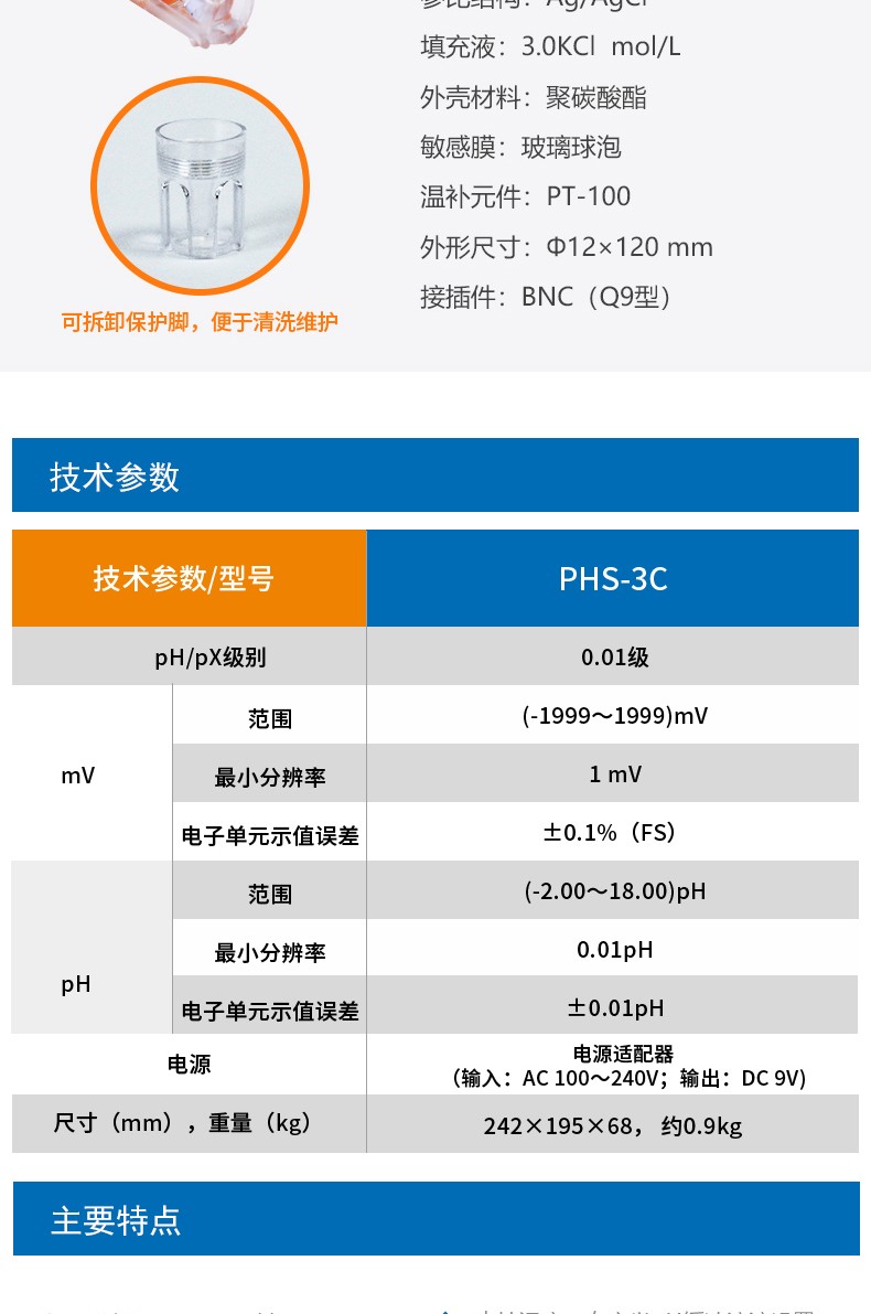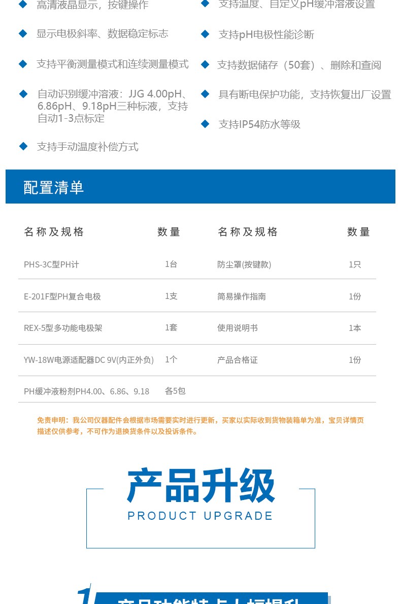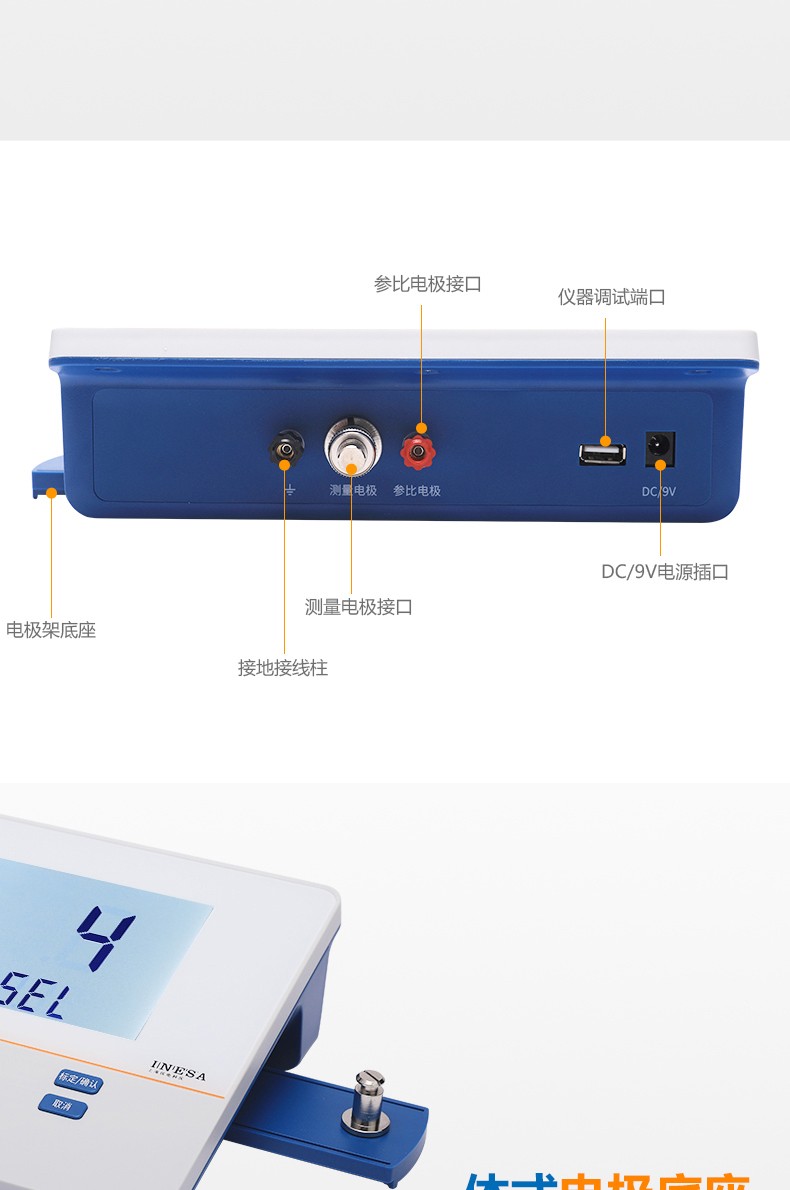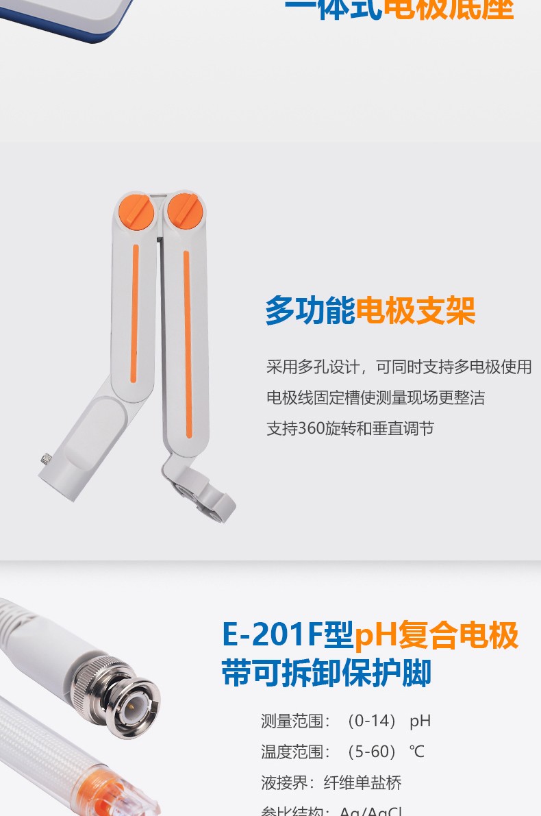 ● 标配复合pH电极、电极支架、防尘罩和校准缓冲粉剂