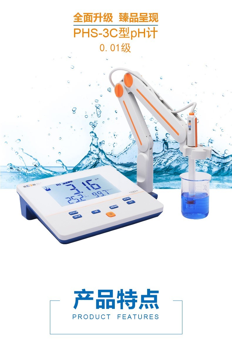 雷磁PHS-3C 精密ph计是一种台式的数显式PH计,两种型号的测量分辨率均为0.01pH,mV值分辨率为1mV。其中PHS-3CPH计是手动进行温度补偿,配备E-201F复合电极。PHS-3C不能对温度值进行测量。本精密ph计是实验室使用的PH计,在化工、食品、科研机构、高等院校等领域广泛应用。