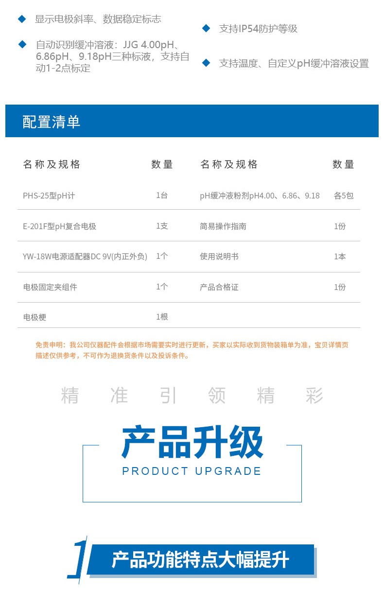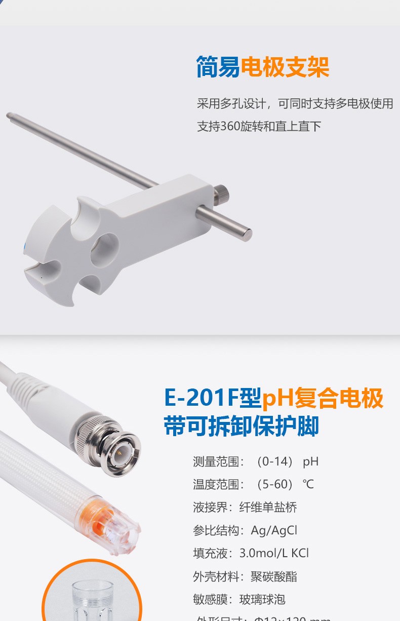● 标配复合pH电极、电极支架、防尘罩和校准缓冲粉剂