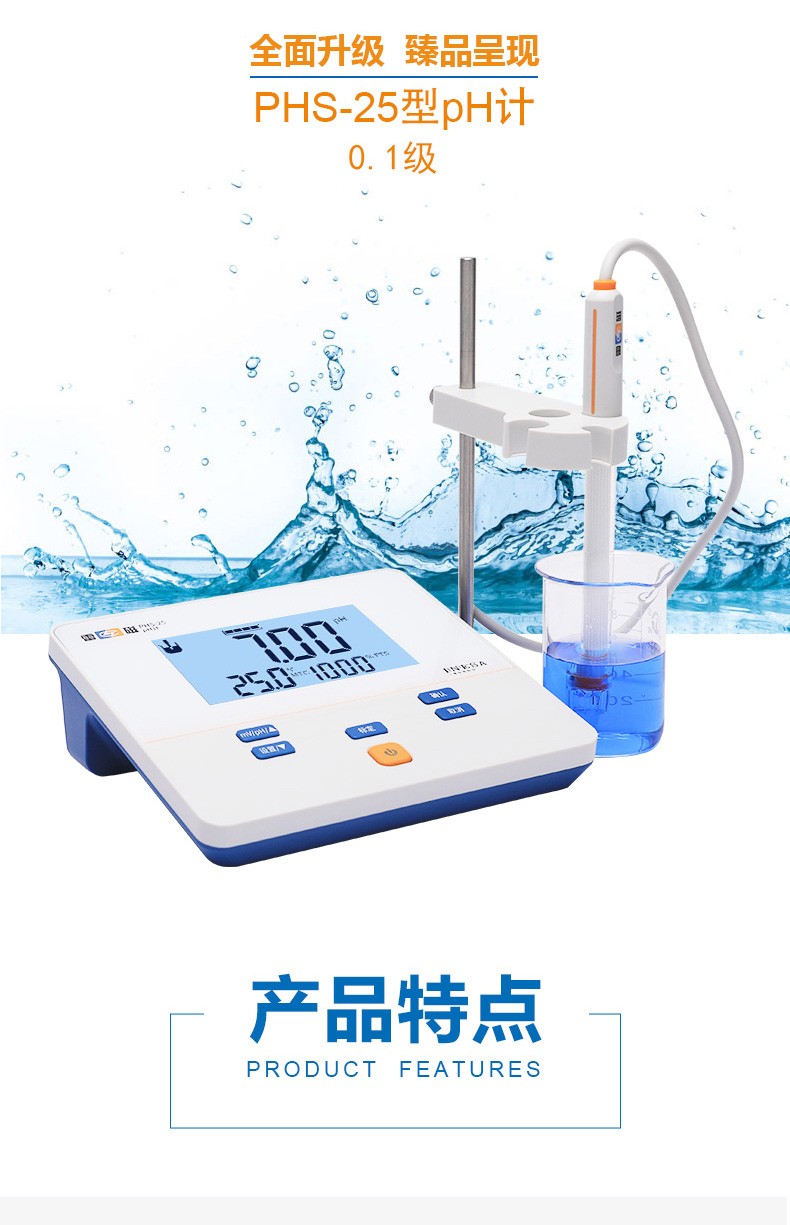 雷磁实验室PH计分为基础型和智能型,PHS-25(数字) 实验室ph计是一种数显式的基础型实验室PH计,科研机构、化工、食品、日化、农产品等领域实验室测定溶液的酸度值,以此来鉴定产品的质量或做实验使用。PHS-25(数字) 实验室ph计采用大屏幕LCD显示,通过手动进行温度补偿,配套雷磁生产的E-201-C型电极。