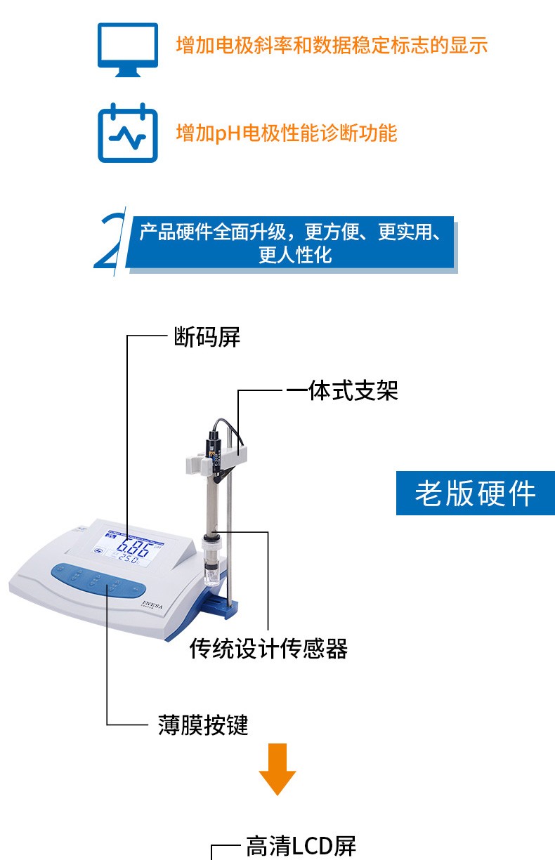 PHS-25(数字) PH计的结构:显示屏、电极夹、电极、电极梗、主机、按键、测量电极插座、参比电极接口、电源插座。