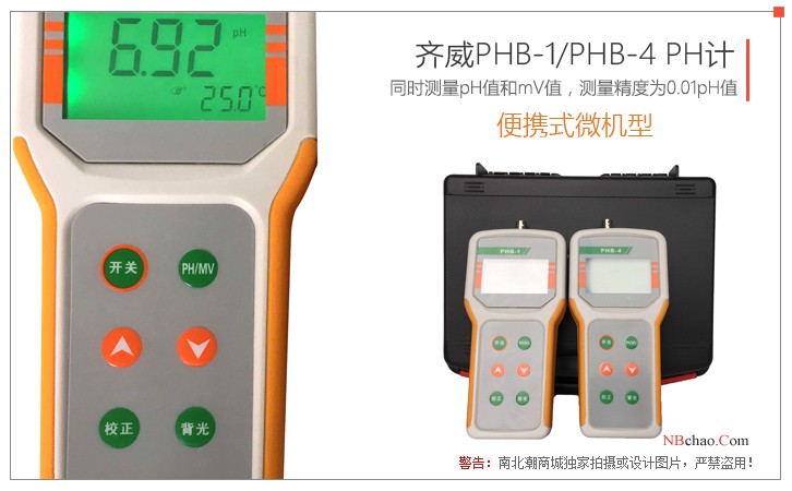 齐威PHB-4 ph测试仪是便携式微机型PH计,由微处理器控制,测量精度为0.01pH值。PHB-4型PH计配E201-C-W塑壳PH三复合电极或018温度电极,PH计可进行自动温度补偿的PH测试。PHB-4 PH计选用了高品质的进口集成元件,测量精准稳定可靠,操作简单方便,适用于实验室测量溶液的pH值和mV值。