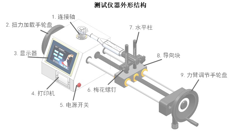 • 水平柱:用于调整扭力扳手的手柄高度,使之在检定仪上水平。