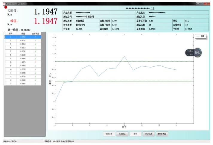 • 试验结果有多种坐标曲线显示:实时扭矩值-时间、峰值扭矩值-次数、第一峰值-次数