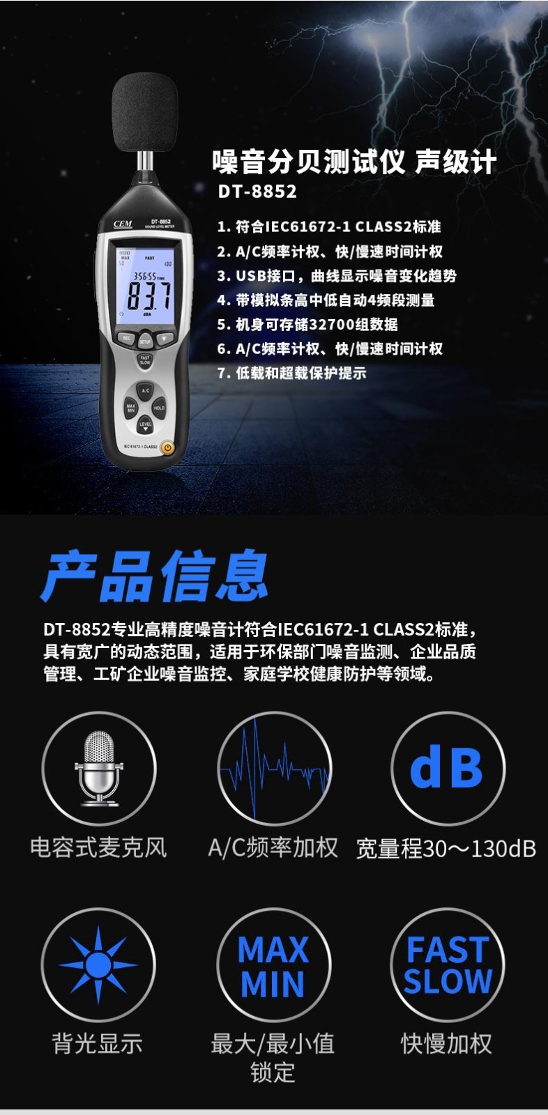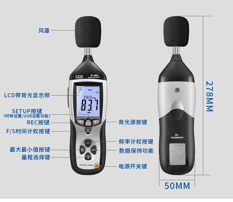 DT-8852专业高精度噪音计符合IEC61672-1 CLASS2标准,具有宽广的动态范围,还具有快/慢速及自动时间常数设置、A/C频率计权、数据保持和记录功能(机身可存储32700个数据);内置USB接口可连接电脑同步测量和传输数据到电脑进行存储和分析。适用于环保部门噪音监测、企业品质管理、工矿企业噪音监控、家庭学校健康防护等领域