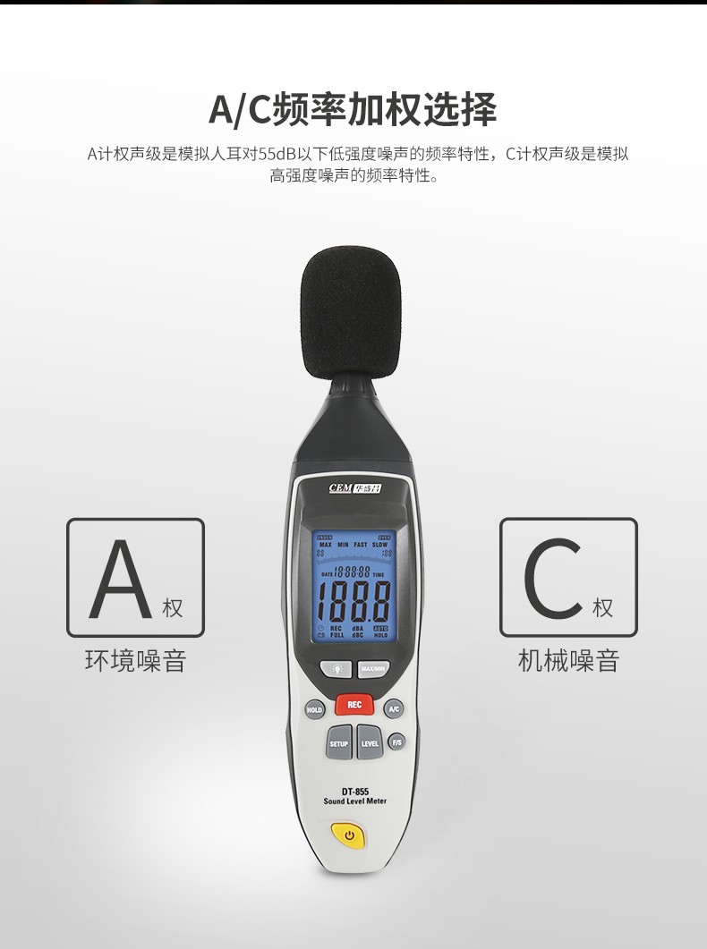 DT-855/855S声级计主要用于噪声工程、质量控制、疾病防治和各种环境噪声测量,适用于测量家居环境、工厂学校、交通干道、机场等环境里的噪音级别。
